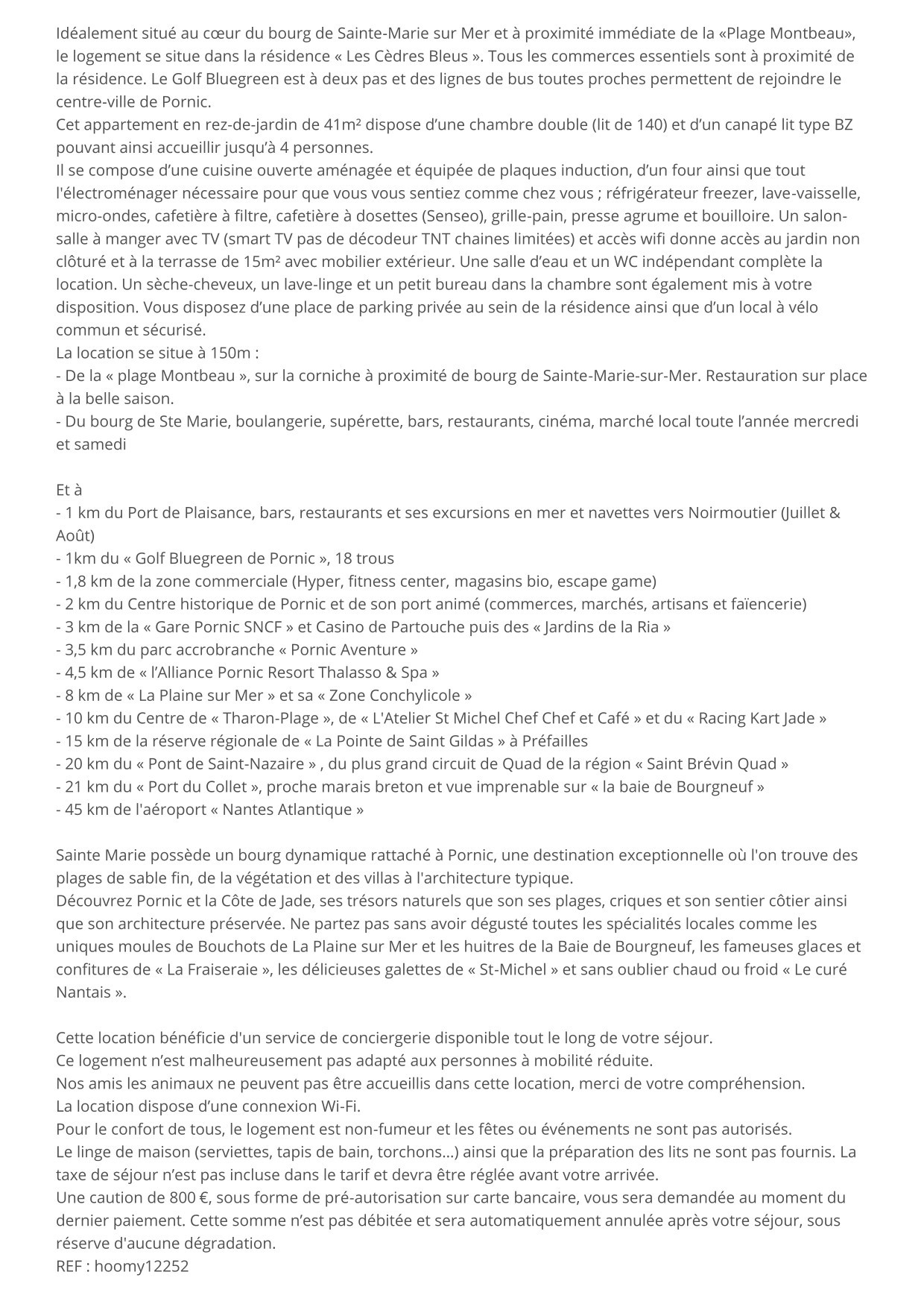 Idealmente ubicado en el corazón del pueblo de Sainte-Marie sur Mer y en las inmediaciones de la «Playa Montbeau», el alojamiento se encuentra en la residencia «Les Cèdres Bleus». Todos los comercios esenciales están cerca de la residencia. El Golf Bluegreen está a dos pasos y líneas de autobús cercanas permiten llegar al centro de la ciudad de Pornic.
