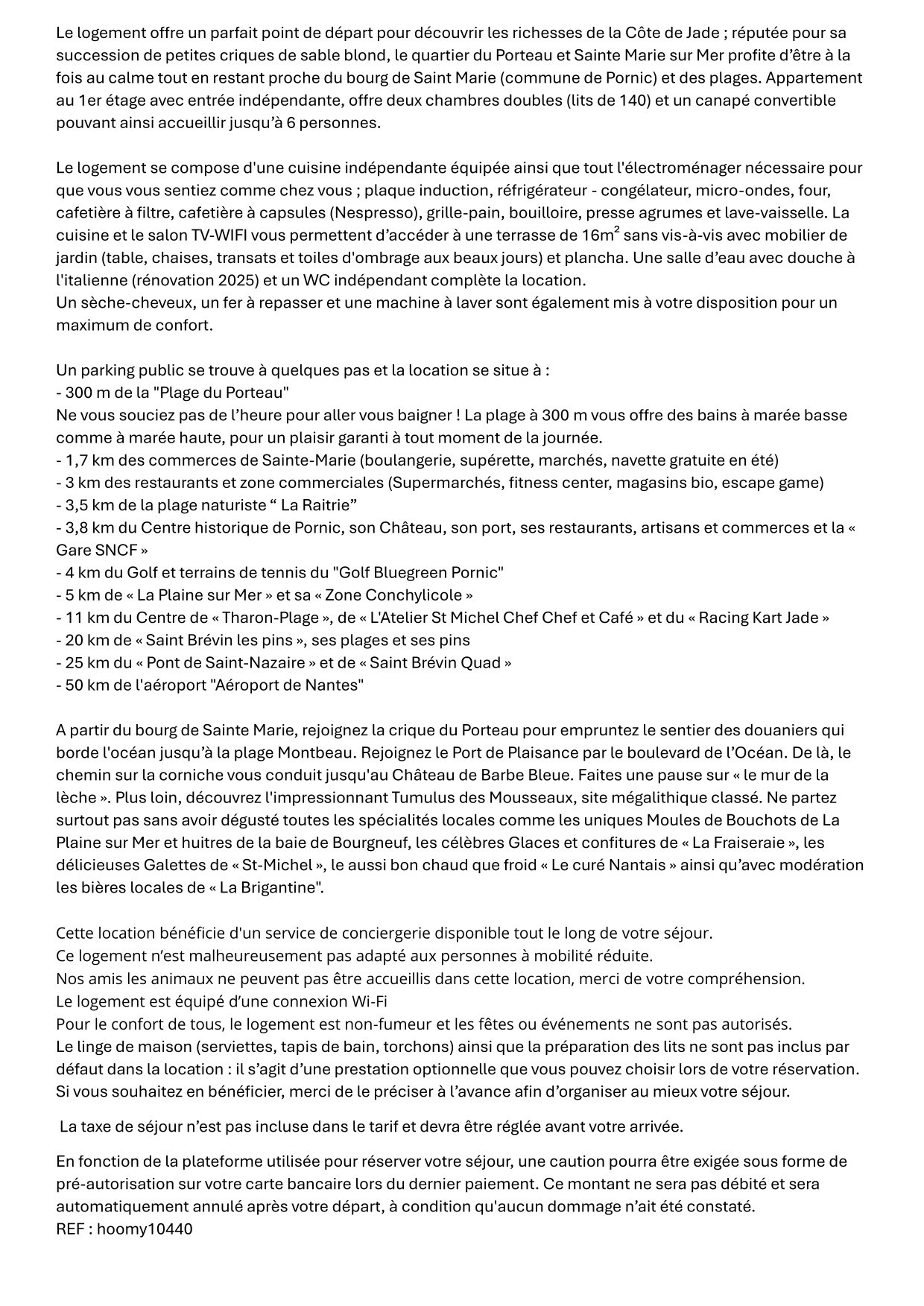 El alojamiento ofrece un punto de partida perfecto para descubrir las riquezas de la Costa de Jade; reconocida por su sucesión de pequeñas calas de arena dorada, el barrio de Porteau y Sainte Marie sur Mer se beneficia de estar a la vez tranquilo mientras permanece cerca del pueblo de Saint Marie (municipio de Pornic) y de las playas. Apartamento en la primera planta con entrada independiente, ofrece dos habitaciones dobles (camas de 140) y un sofá cama que puede acoger hasta 6 personas.
