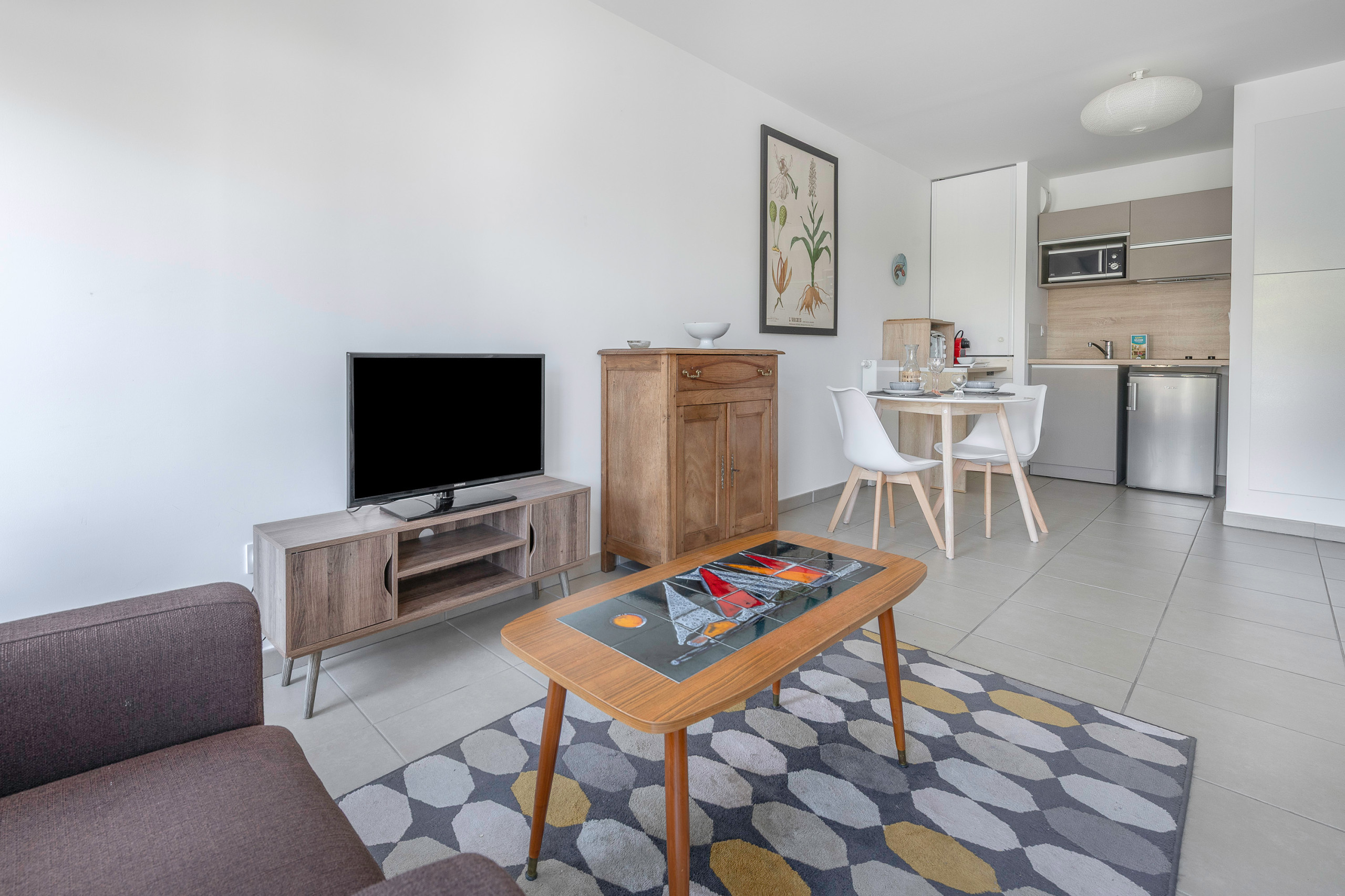 El alojamiento dispone de un salón-TV que da acceso a una pequeña terraza, con una cocina amueblada y equipada; placas de inducción, microondas, horno pequeño, cafetera de cápsulas Nespresso, frigorífico-congelador, tostadora, hervidor, utensilios y menaje de cocina. También se pone a su disposición un secador de pelo, una lavadora, así como mobiliario exterior (sillones, mesa y sombrilla). Dispone de una plaza de aparcamiento privada y cubierta dentro de la residencia.