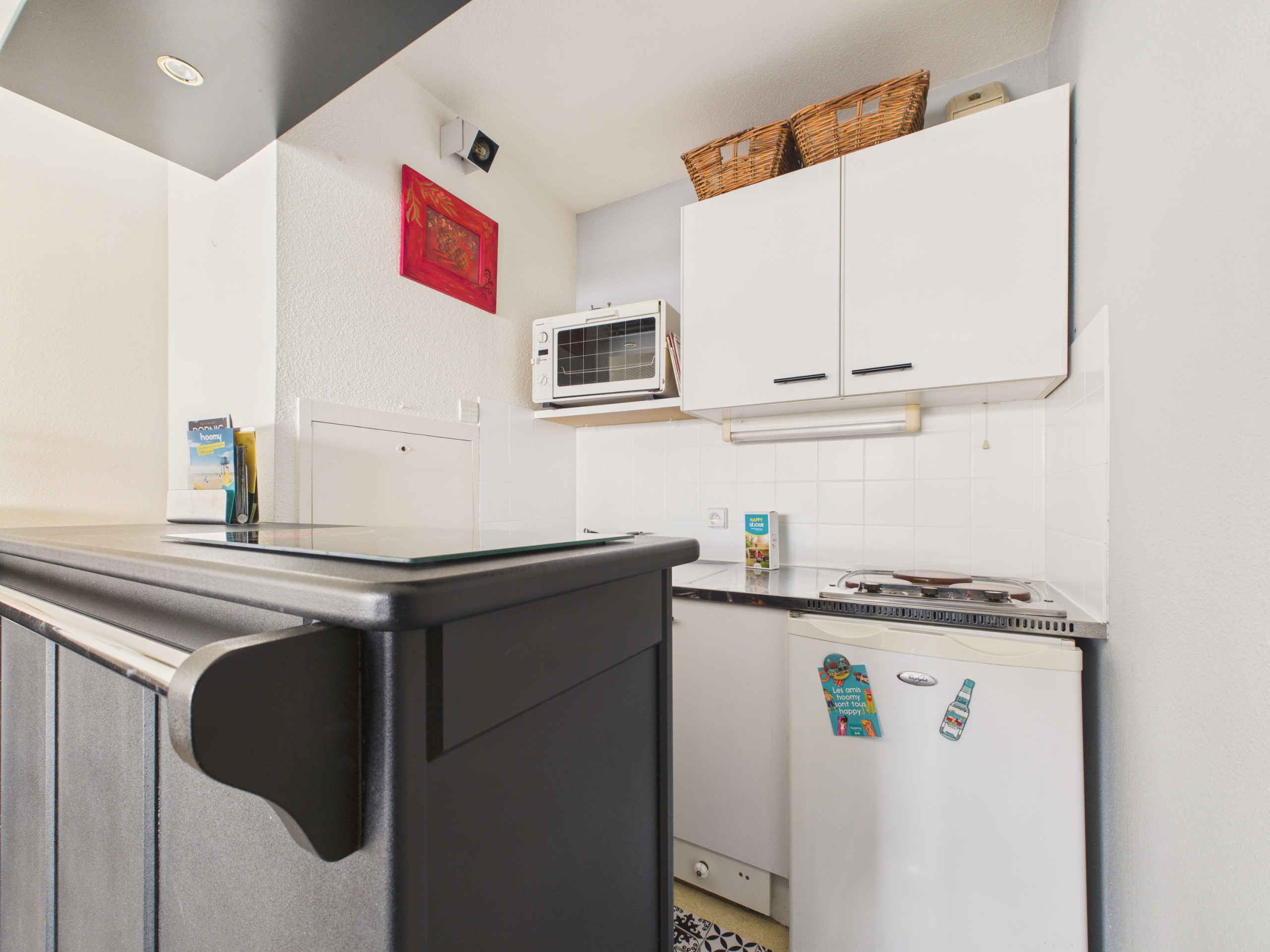 Se compone de una cocina abierta equipada con placas de inducción, un pequeño horno, así como todos los electrodomésticos necesarios para que se sienta como en casa; refrigerador-congelador, lavavajillas, cafetera de filtro, cafetera de cápsulas (Nespresso), tostadora, hervidor, exprimidor y utensilios de cocina. Un salón de TV con mesa alta, da acceso al balcón de 8m² con muebles de exterior, parrilla eléctrica y tumbonas. Un baño y un aseo independiente completan el alquiler. Un secador de pelo y una lavadora también están a su disposición. Dispone de una plaza de aparcamiento privada dentro de la residencia, así como de un local para bicicletas común y seguro.