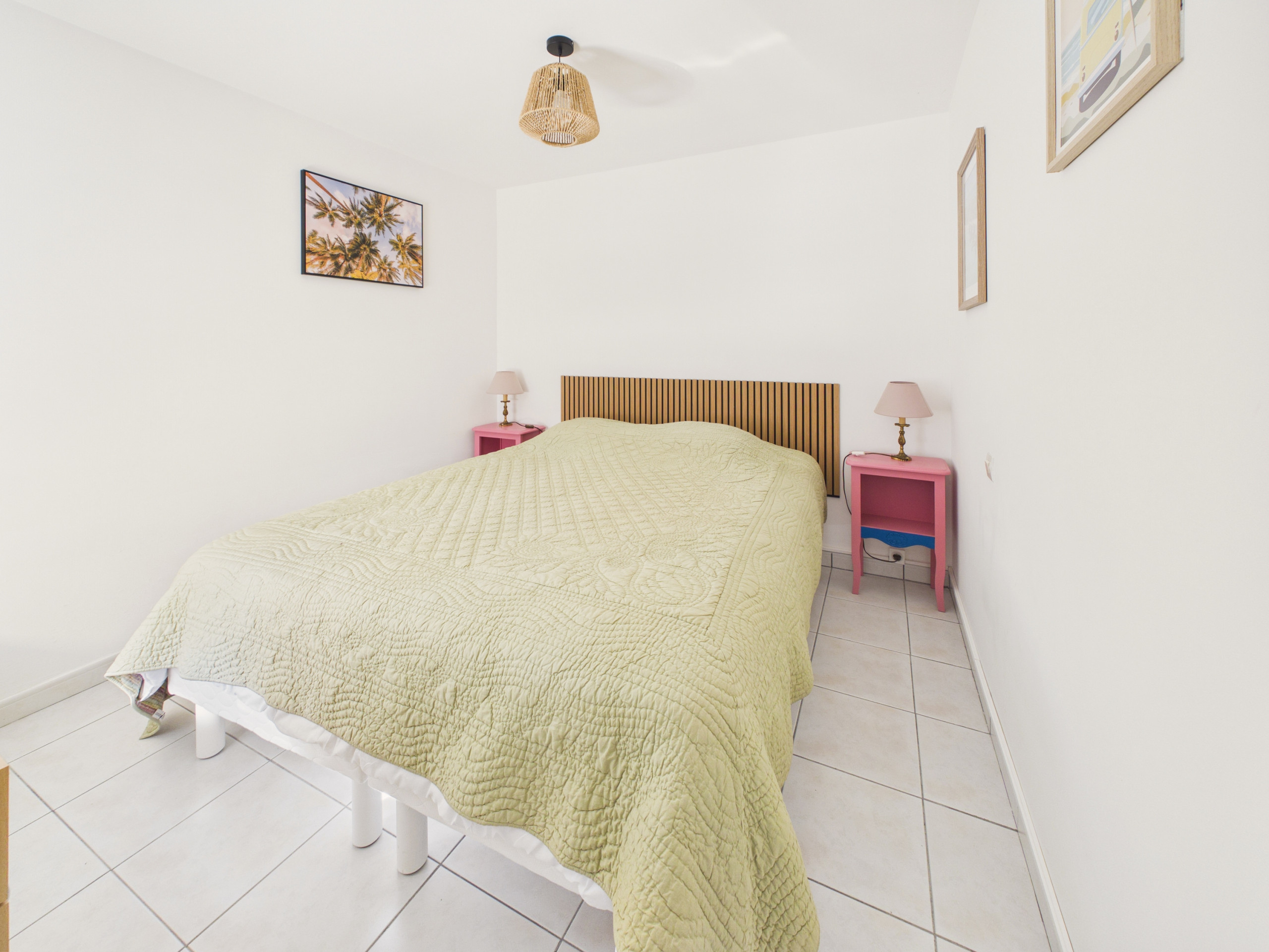 La planta baja ofrece un estudio independiente de 45m² completamente equipado que dispone de una habitación doble con cama de 160x200 y una segunda con dos camas individuales (80x200). Luego una cocina abierta al salón, equipada con una mesa alta con taburetes, placas de gas, un microondas, un frigorífico, una cafetera de filtro, un lavavajillas, una tostadora, una tetera y diversos utensilios de cocina. El salón dispone de un televisor y da acceso a una terraza de madera de 15m² con mobiliario exterior. (Mesa, sillas, barbacoa, sombrilla) Un cuarto de baño con WC completa el estudio.