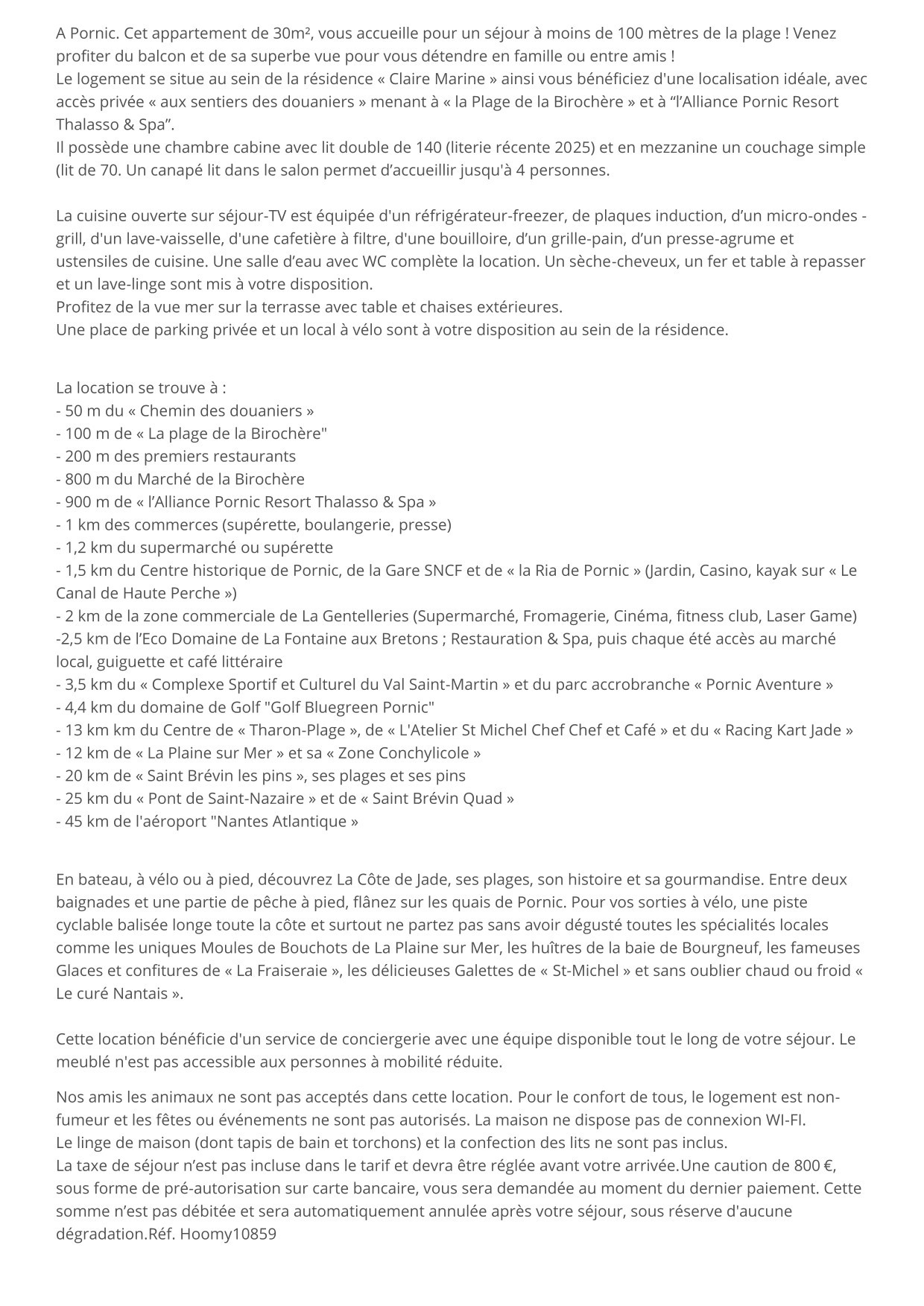 El alojamiento se encuentra dentro de la residencia "Claire Marine", por lo que dispone de una ubicación ideal, con acceso privado a los "senderos de aduaneros" que conducen a "la Playa de la Birochère" y al Alliance Pornic Resort Thalasso & Spa.