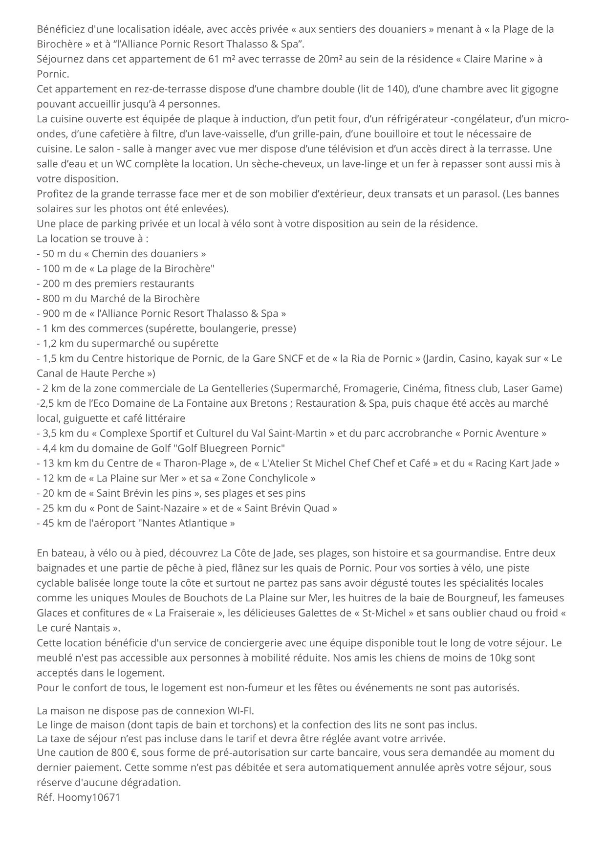 El alojamiento se encuentra dentro de la residencia "Claire Marine", por lo que dispone de una ubicación ideal, con acceso privado a los "senderos de aduaneros" que conducen a "la Playa de la Birochère" y al Alliance Pornic Resort Thalasso & Spa.