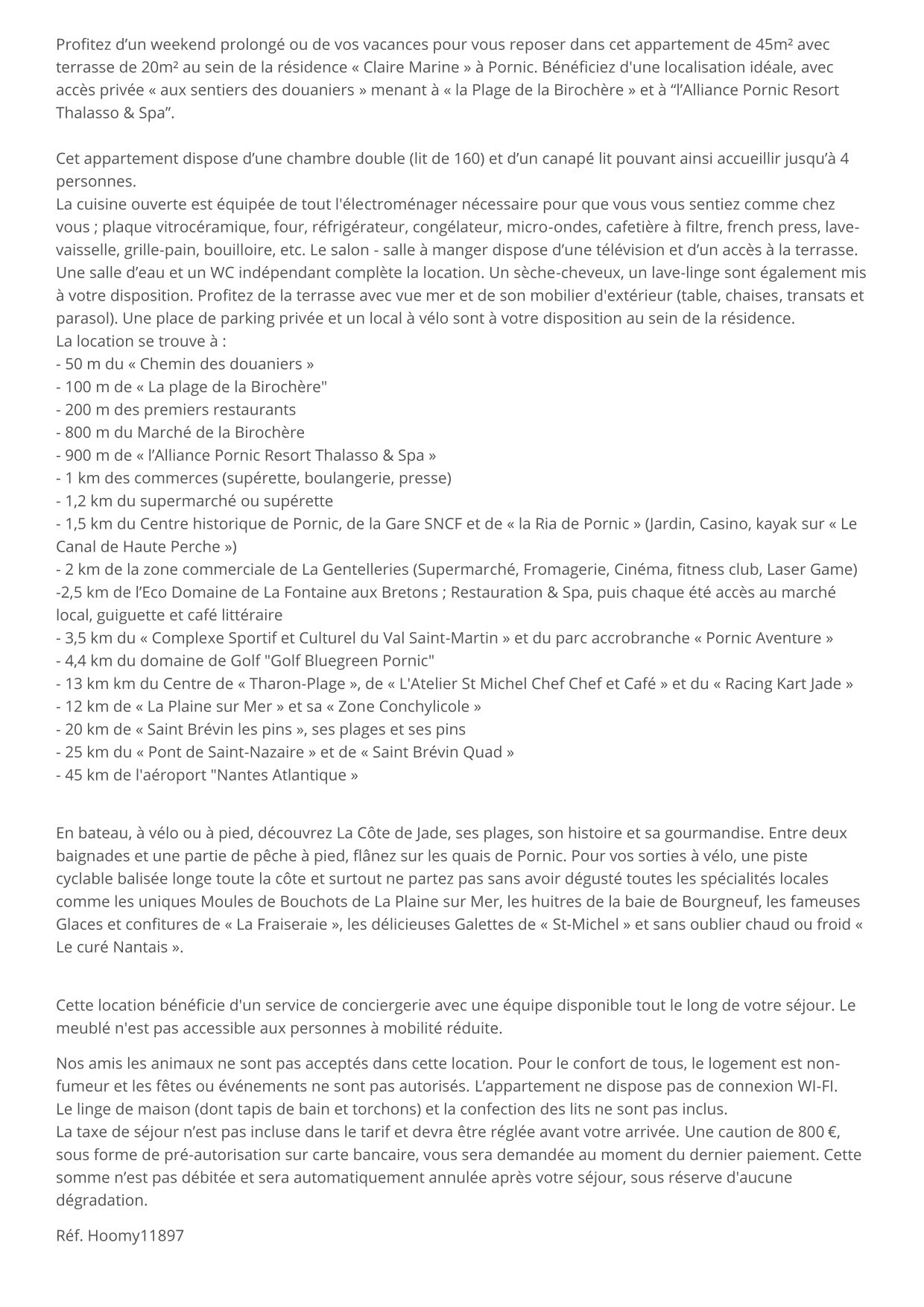 El alojamiento se encuentra dentro de la residencia "Claire Marine", por lo que dispone de una ubicación ideal, con acceso privado a los "senderos de aduaneros" que conducen a "la Playa de la Birochère" y al Alliance Pornic Resort Thalasso & Spa.