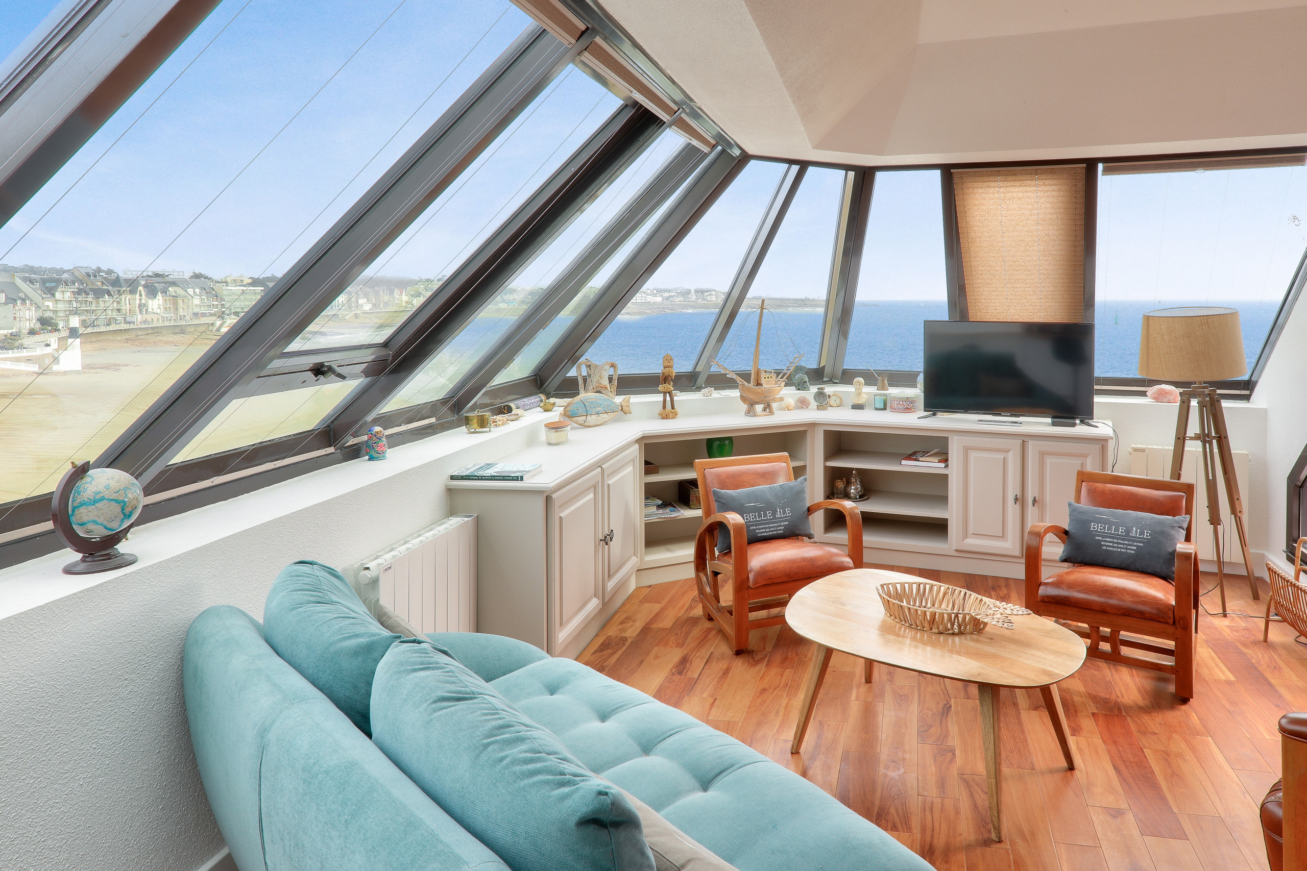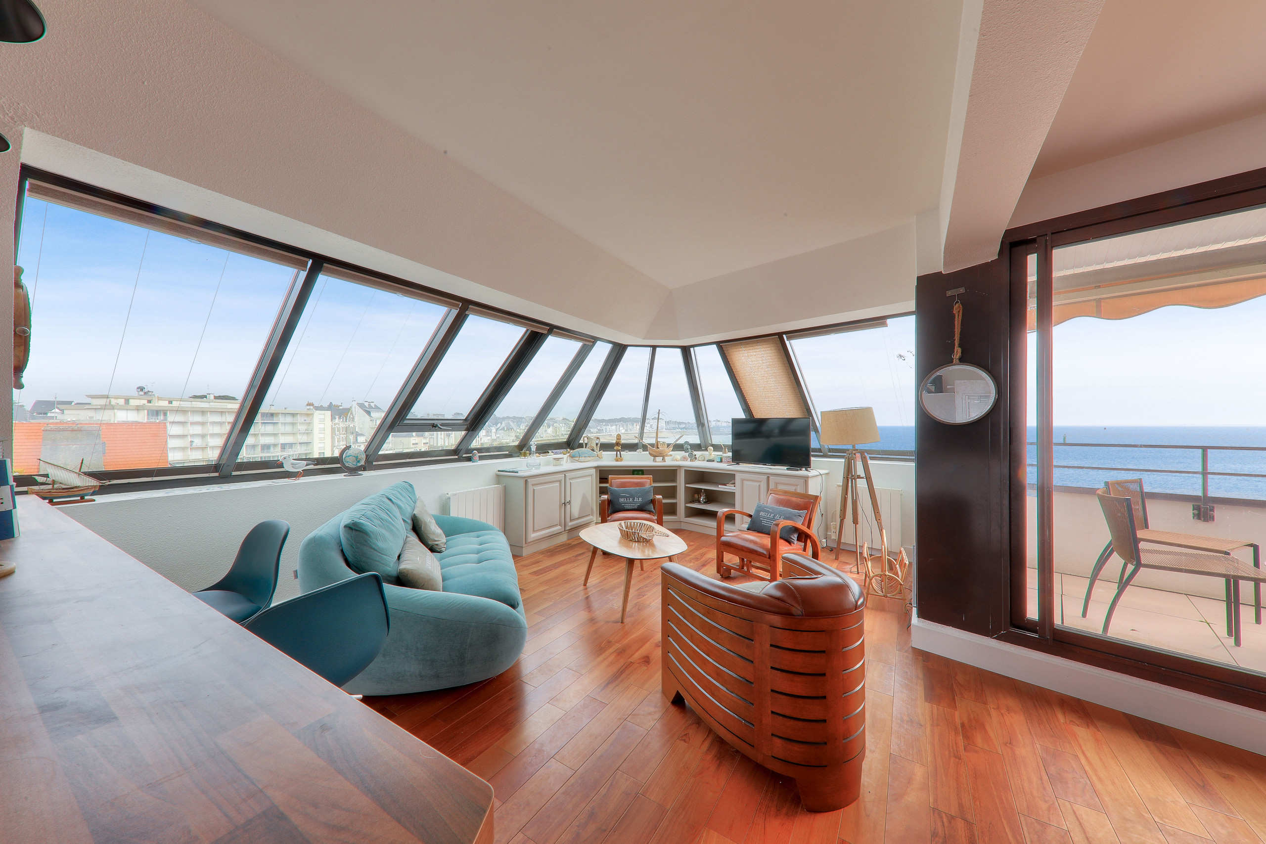 La sala de estar y el comedor del apartamento son muy agradables gracias a su hermoso parquet de cubierta tipo barco, sus toques marinos y la extensión de 180° de los ventanales con vista al mar. Tendrá la sensación de estar en la proa de un barco. Permiten contemplar la vista del cielo azul y el mar. Le gustará reunirse en la sala de estar para compartir momentos de convivencia, charlar o descansar frente a una película en la televisión, luego podrá disfrutar de una buena comida en el comedor antes de disfrutar de una taza de café en el balcón mientras disfruta de la aire del mar.