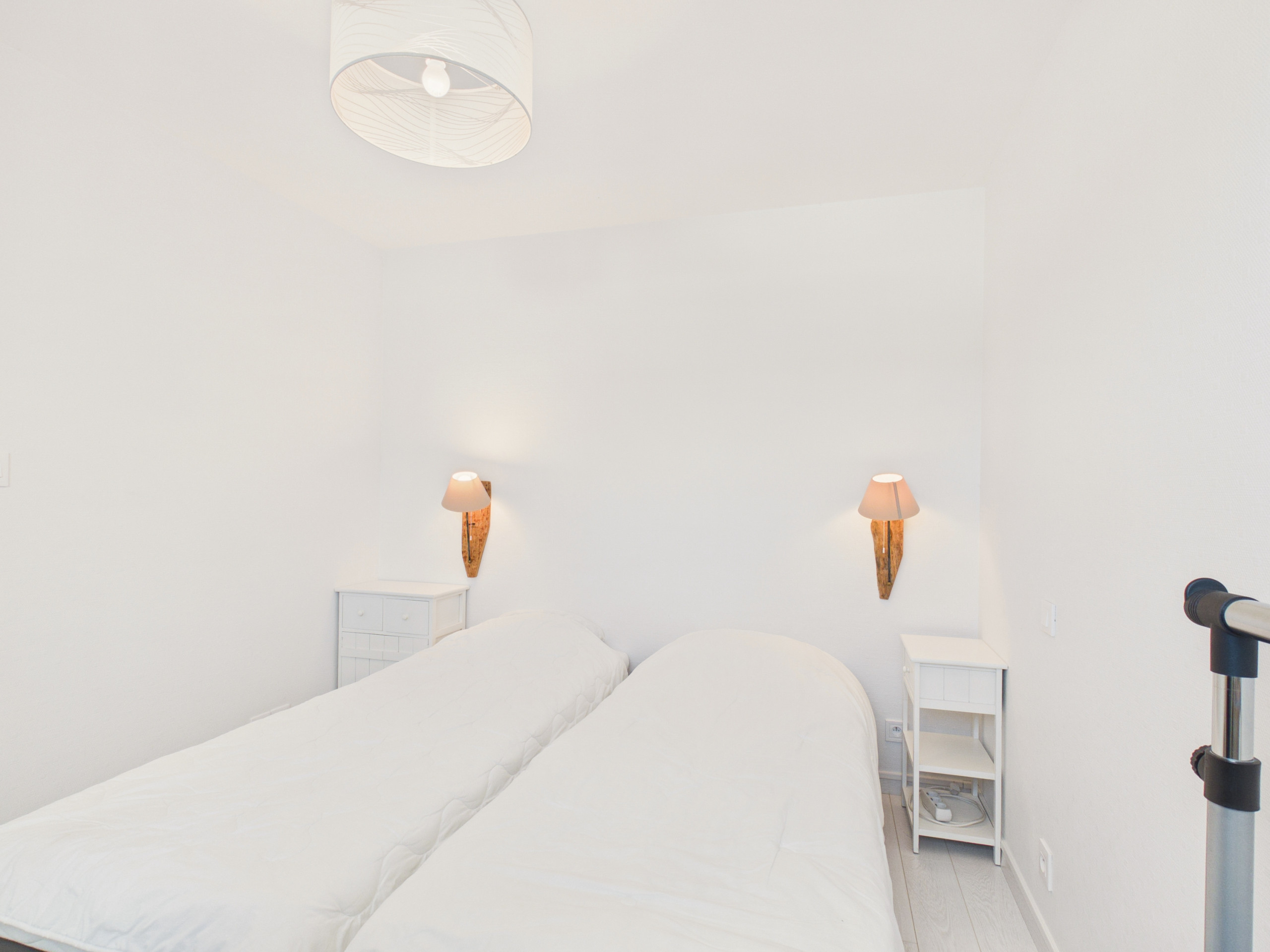 Habitación 1: dos camas individuales (80 x 190 cm) que pueden juntarse para formar una cama Queen Size, un armario y un estante de almacenamiento.