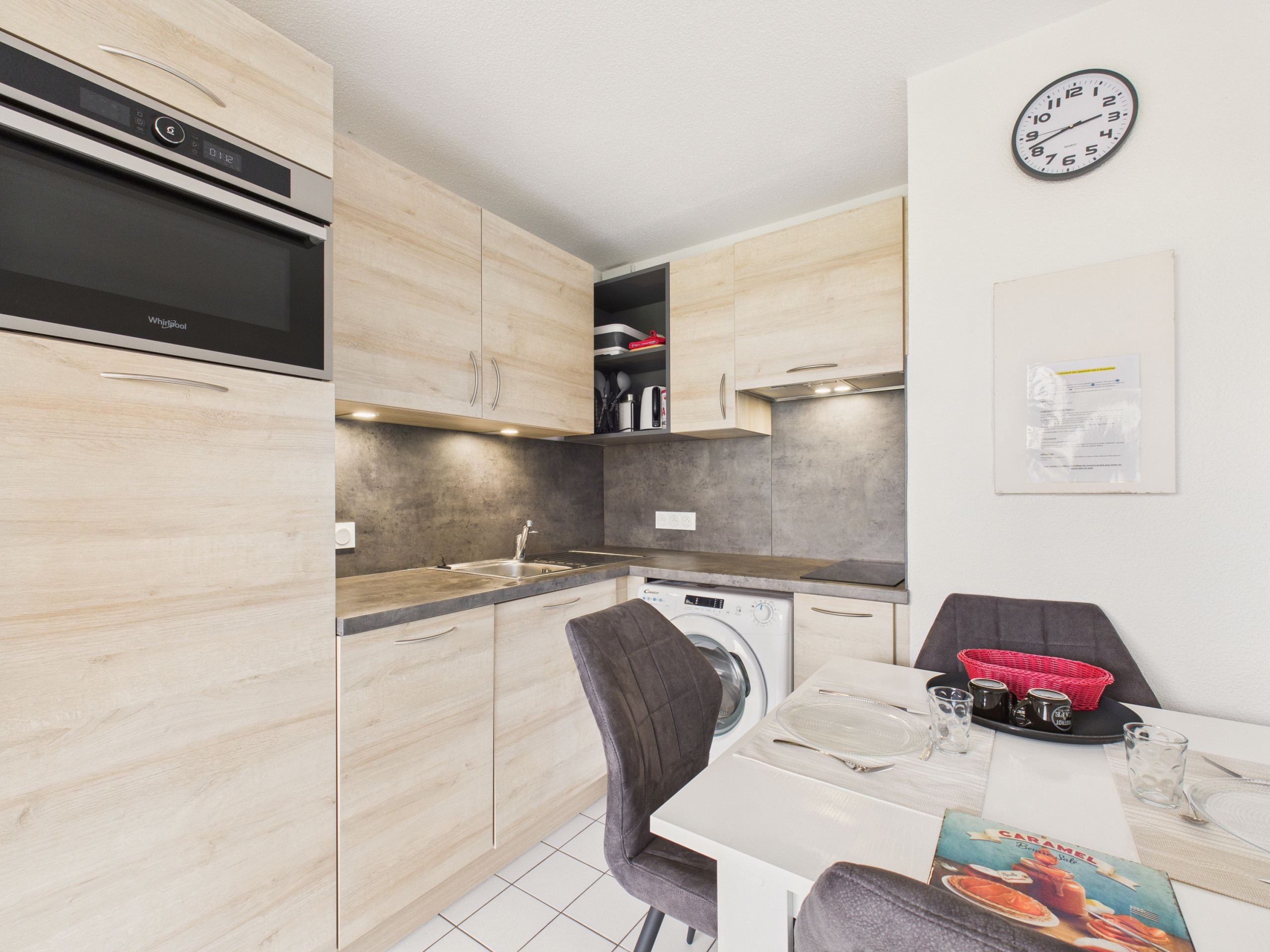 En el interior, descubra una gran sala de estar de más de 30 m² que ofrece un acceso directo al balcón. La cocina abierta, completamente equipada (refrigerador, congelador, horno, microondas, placas de inducción, lavavajillas), le permite preparar sus comidas como en casa. Para el desayuno, también tiene a su disposición una hervidor de agua, una tostadora, una cafetera de filtro y una máquina Nespresso. Comparta sus comidas alrededor de la mesa de comedor interior o disfrute de la del balcón en los días bonitos. Por la noche, relájese en la zona de estar, cómodamente sentado en el sofá frente a la televisión.