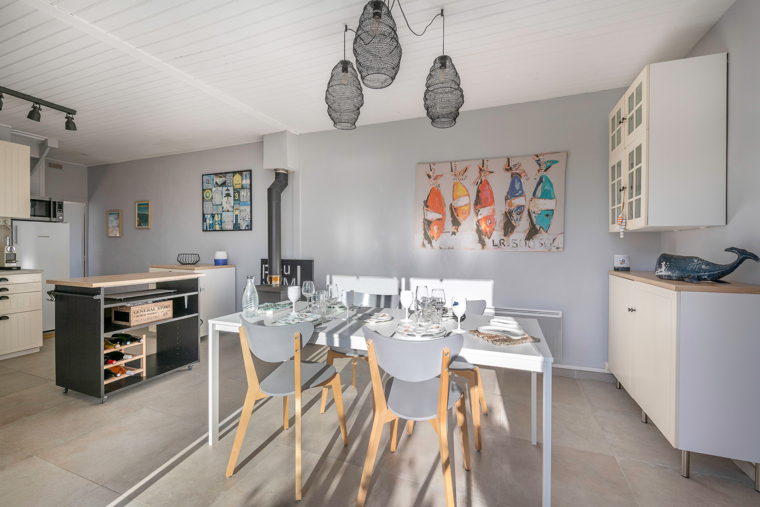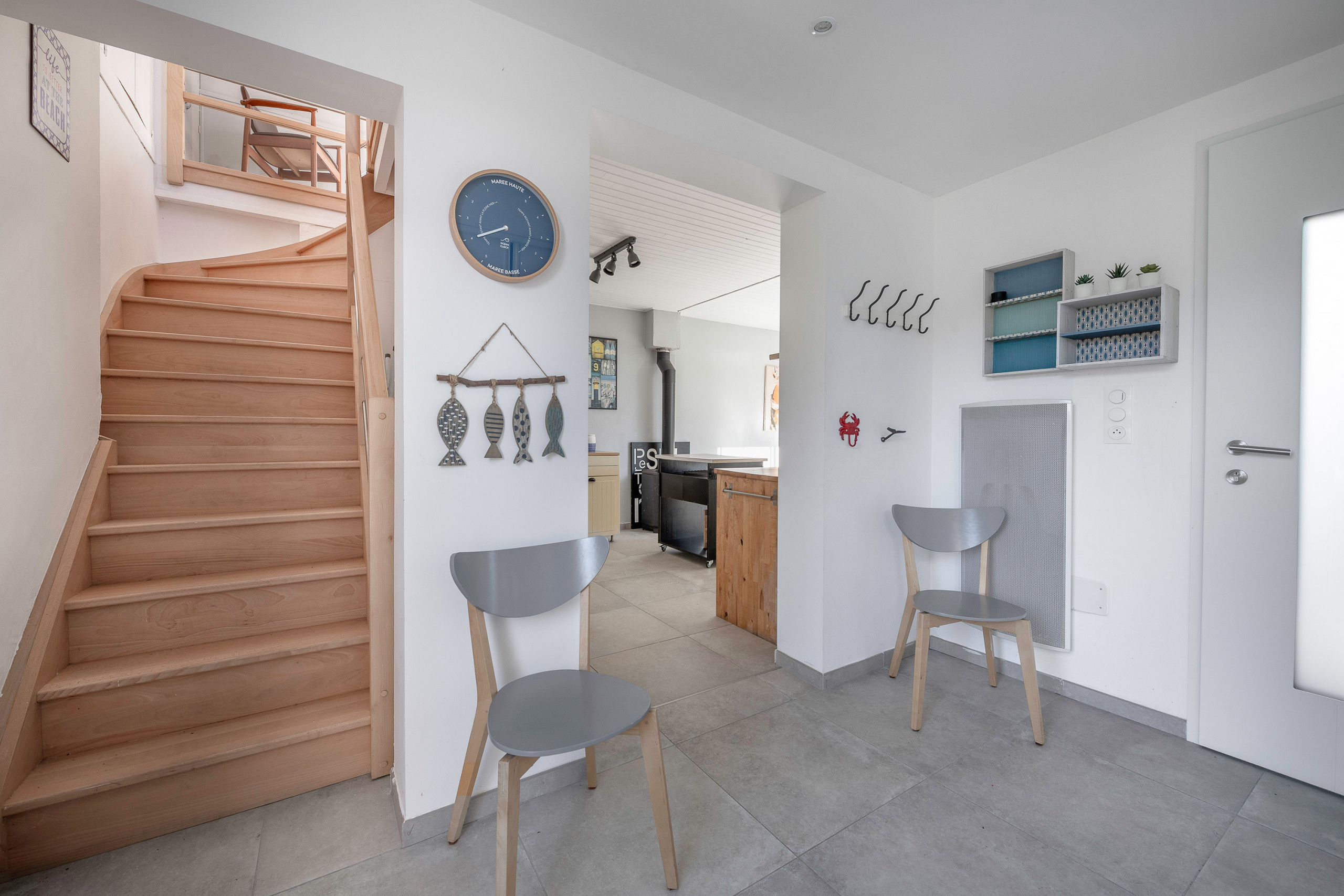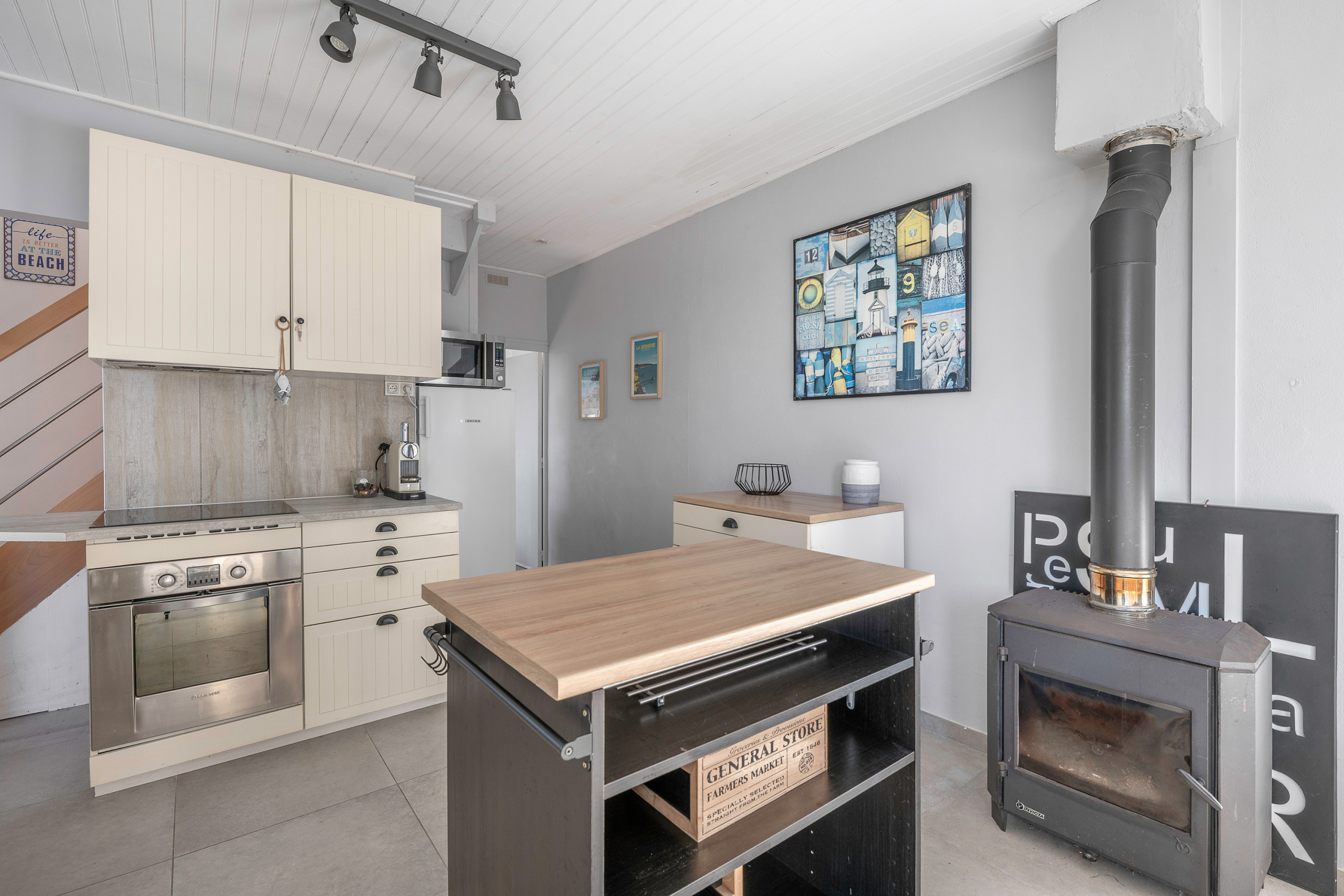 El espacio de vida de la planta baja cuenta con una cocina abierta totalmente equipada (placa de inducción, microondas, horno, cafetera de filtro y cápsulas, lavavajillas, tostadora, hervidor, exprimidor, utensilios y menaje de cocina), un comedor con televisor, una sala de estar de TV independiente y un aseo separado. Dos cuartos de baño completan esta propiedad.