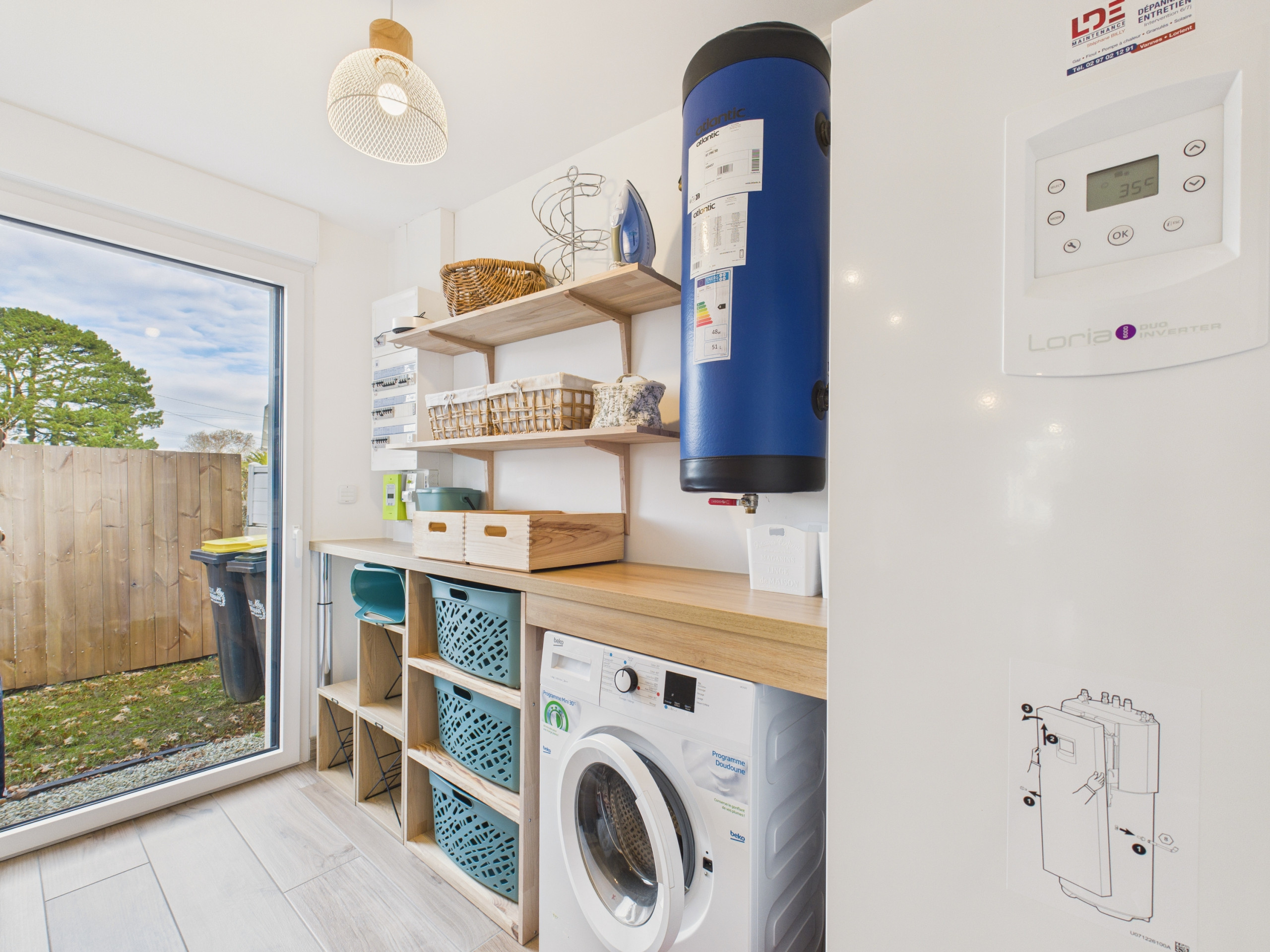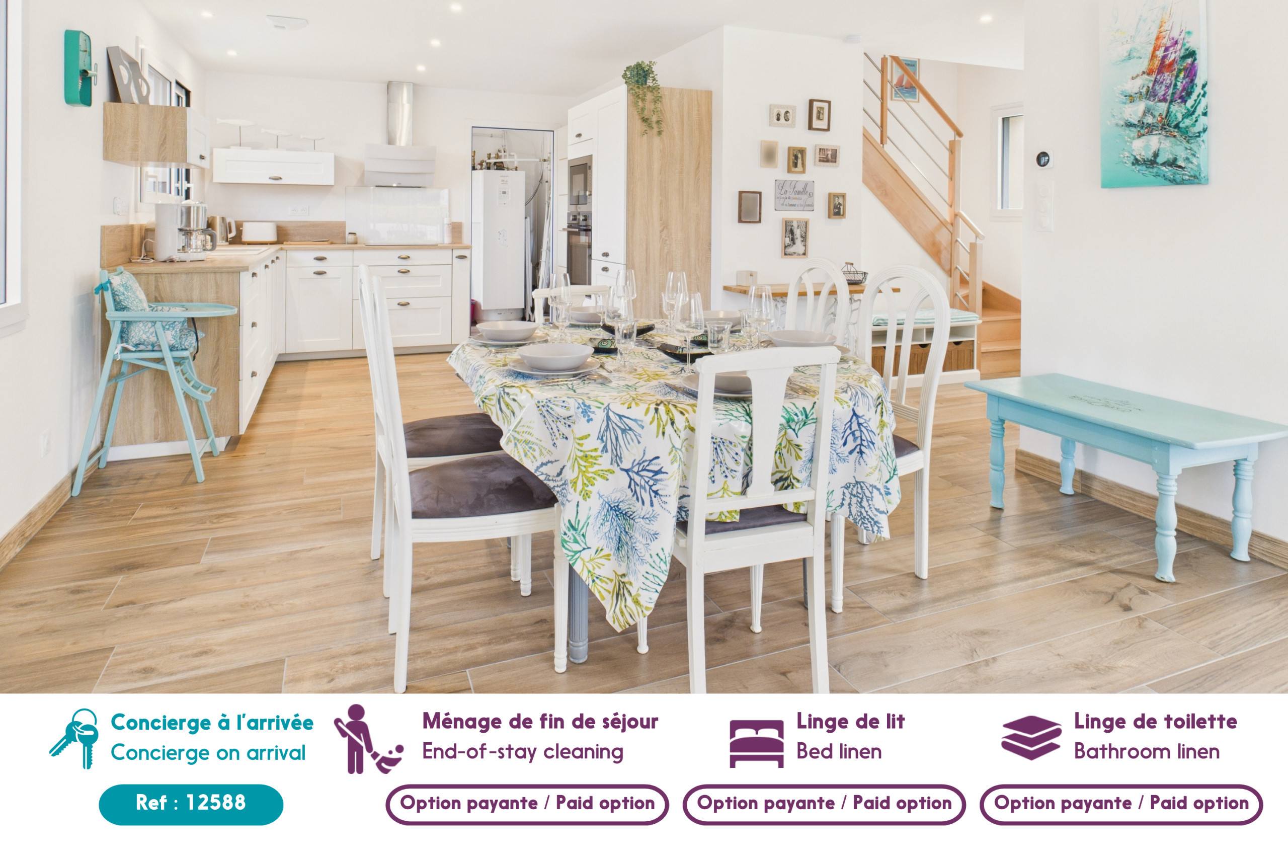 En el interior, descubrirá una hermosa sala de estar, abierta a la terraza gracias a un amplio ventanal. La cocina, abierta y moderna, está completamente equipada (refrigerador, congelador, microondas, horno, placas de inducción, lavavajillas) y le permitirá preparar sus comidas con toda simplicidad. Para sus desayunos, también hay disponible una hervidor de agua, una tostadora, una cafetera de filtro y una cafetera Tassimo. Podrá compartir sus comidas alrededor de la mesa del salón o disfrutar de la mesa exterior durante el verano. Por la noche, disfrute del sofá y la televisión después de un día de descubrimiento de la península.
