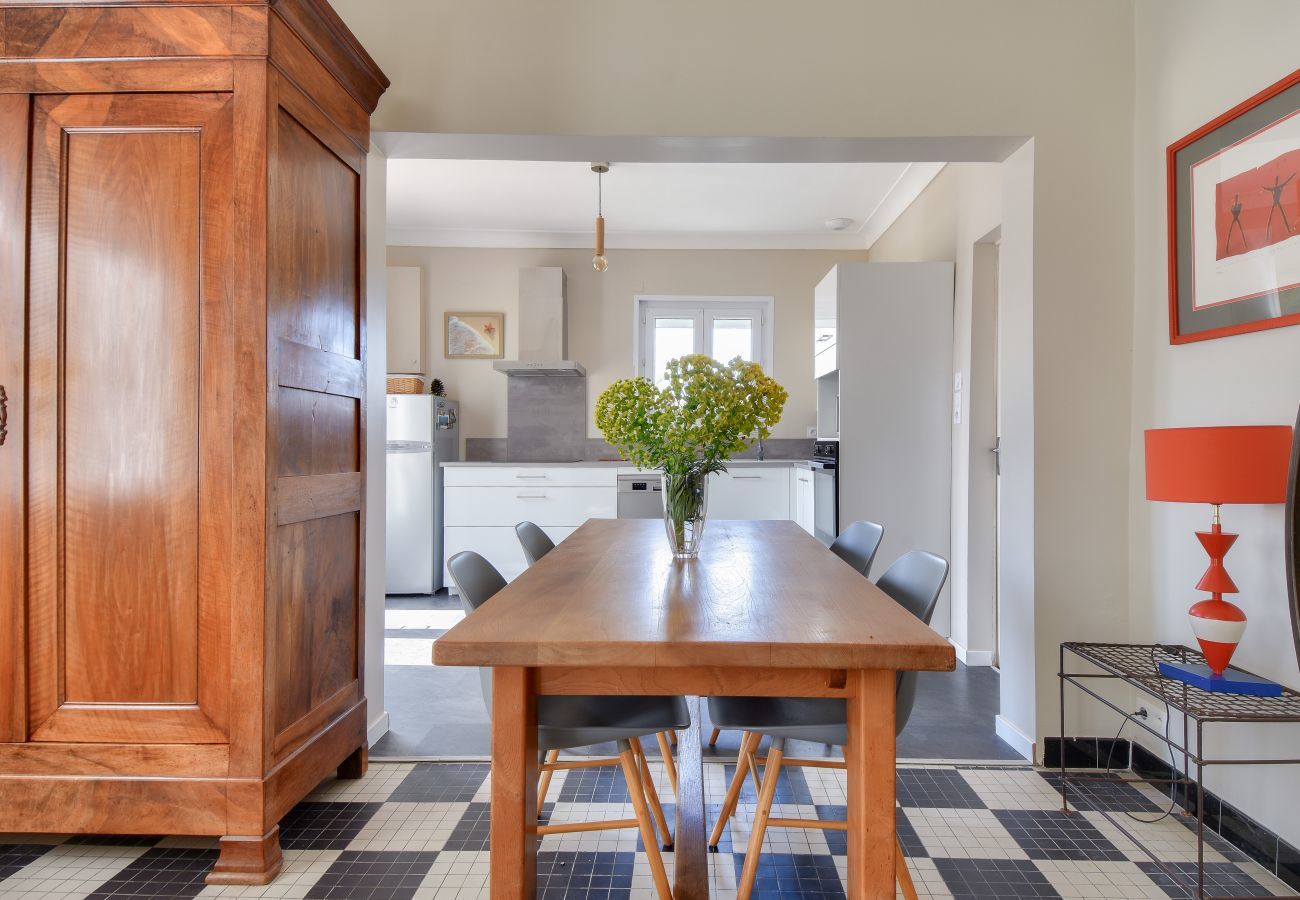 En el interior, el salón-comedor con toques de color y su suelo de damero será el lugar ideal para un momento de relajación en el salón o para compartir buenas comidas todos reunidos alrededor de la mesa de madera. Después, encontrará la cocina, moderna y espaciosa, que cuenta con todo lo necesario: placas de inducción, frigorífico, microondas, horno, congelador, lavavajillas, cafetera Dolce Gusto, tostadora y hervidor.