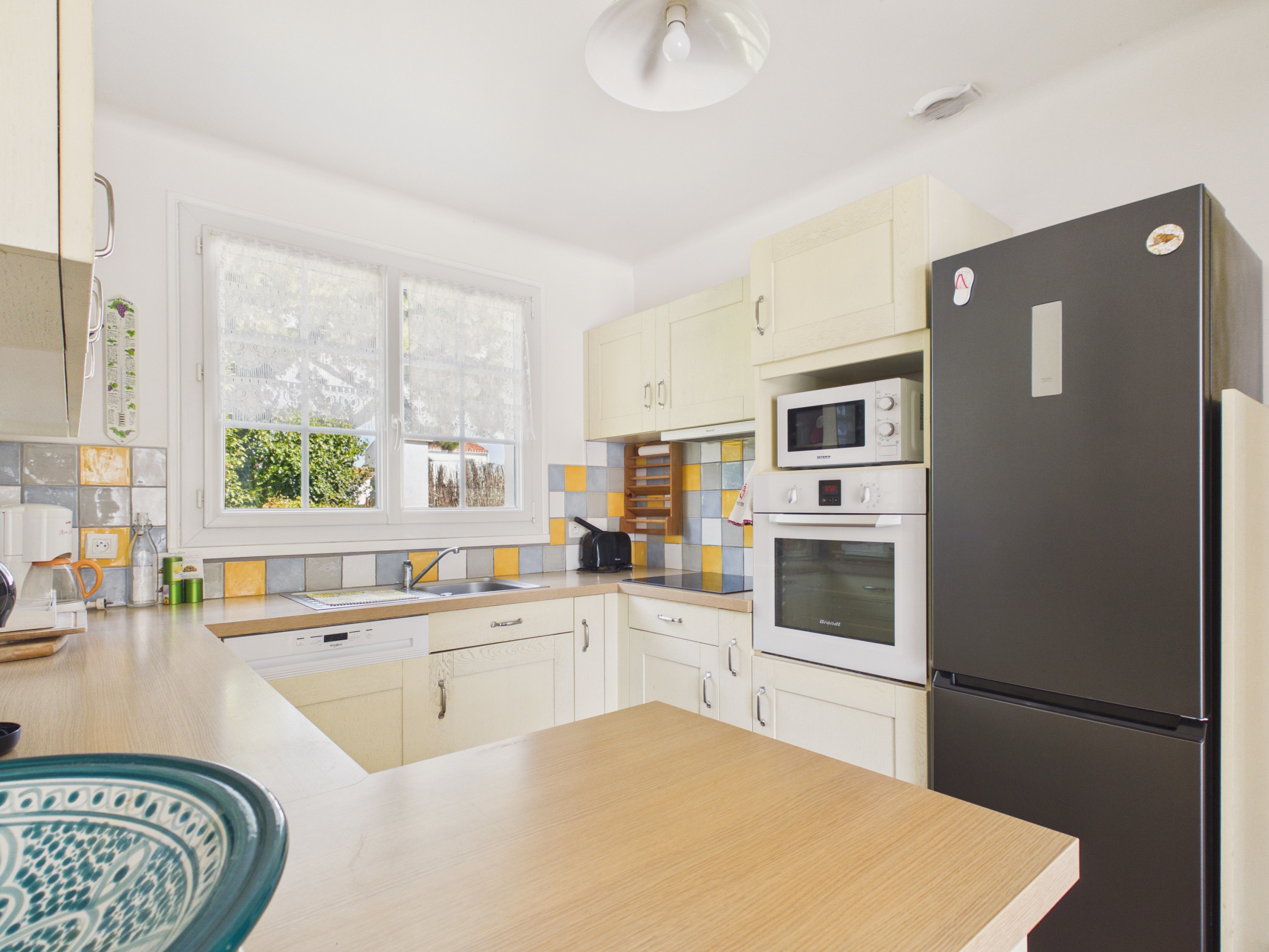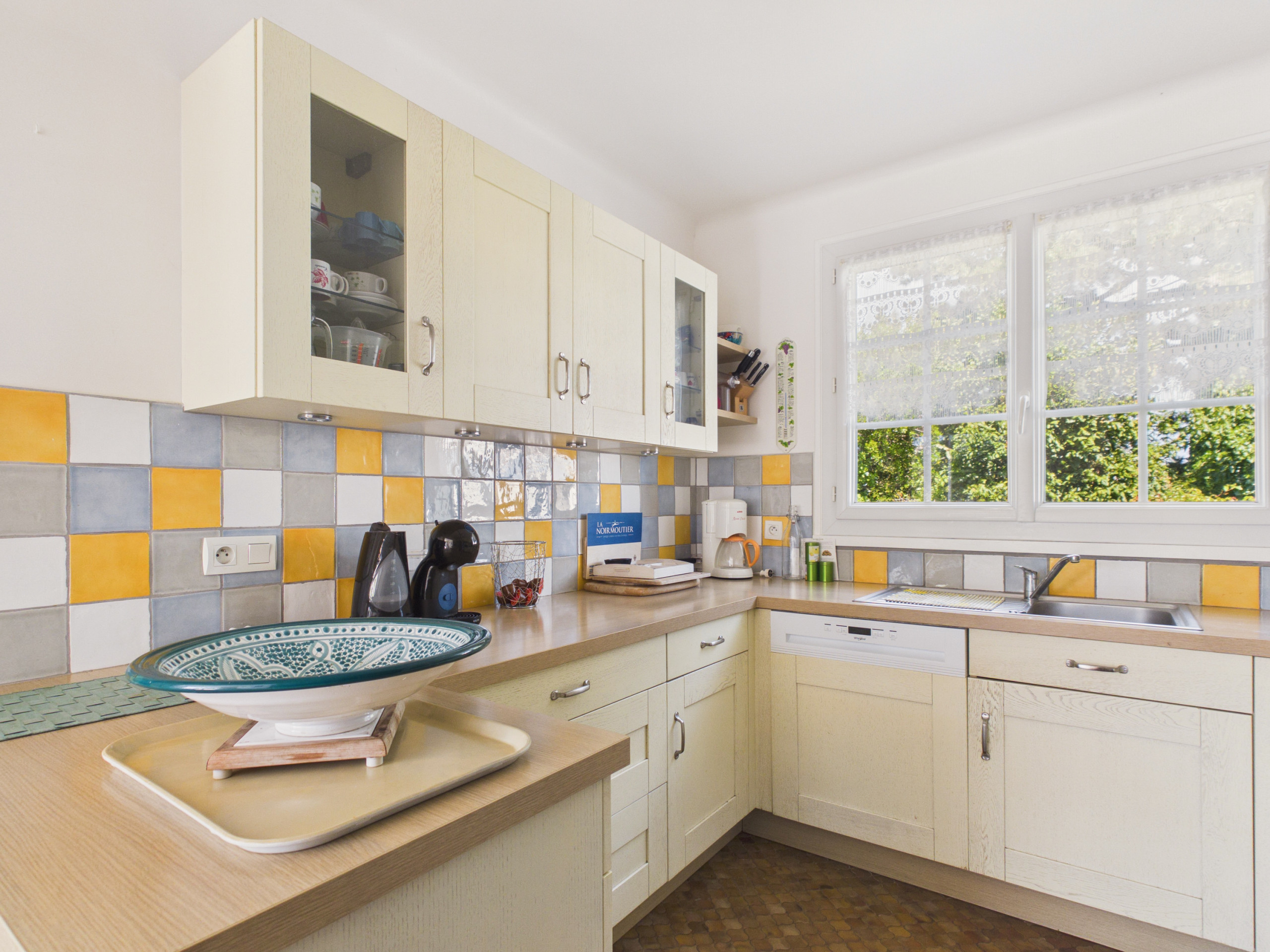 En el interior, el salón-comedor con toques de color y su suelo de damero será el lugar ideal para un momento de relajación en el salón o para compartir buenas comidas todos reunidos alrededor de la mesa de madera. Después, encontrará la cocina, moderna y espaciosa, que cuenta con todo lo necesario: placas de inducción, frigorífico, microondas, horno, congelador, lavavajillas, cafetera Dolce Gusto, tostadora y hervidor.