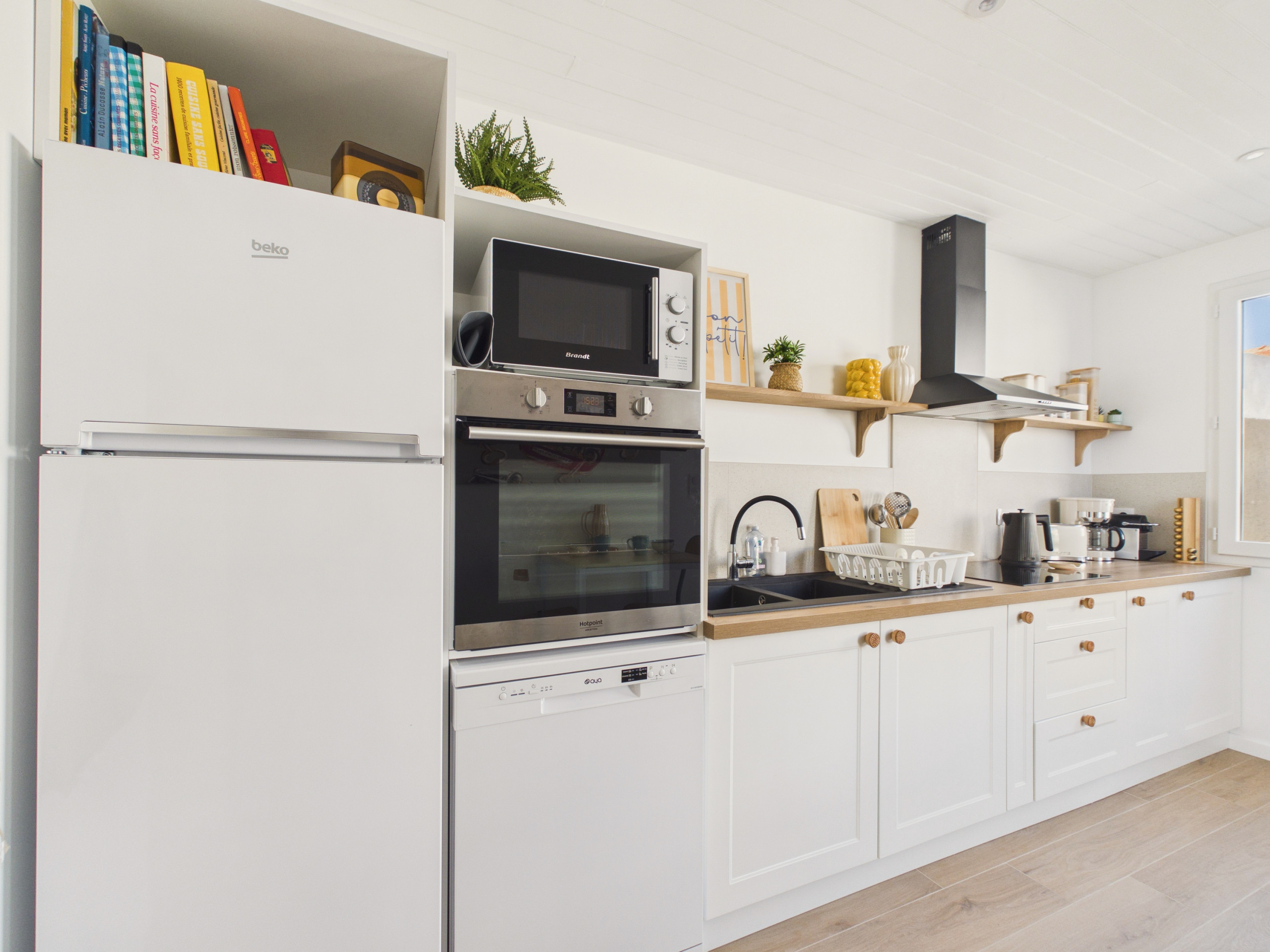 La cocina independiente, moderna y funcional, también cuenta con una pequeña mesa para tres personas, ideal para un desayuno rápido. Está completamente equipada: placas de inducción, refrigerador, congelador, horno, microondas, lavavajillas, cafeteras de filtro y Nespresso, tostadora, hervidor y todo lo necesario para cocinar como en casa.