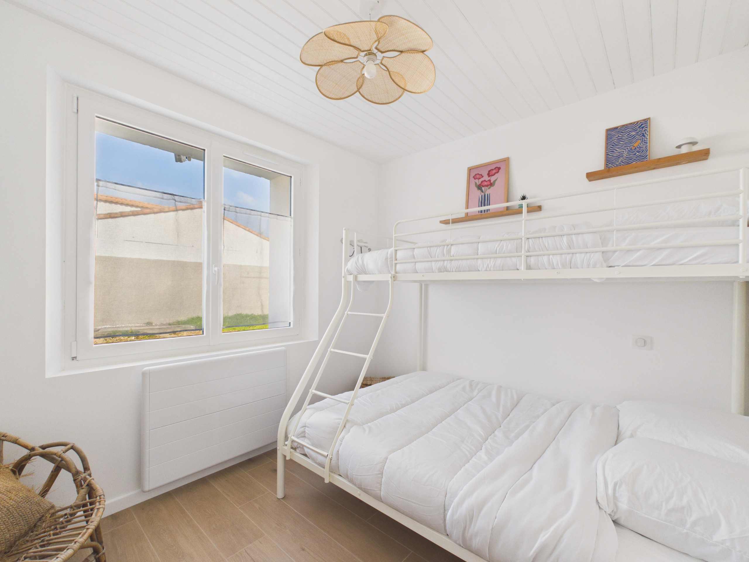 - Habitación 2: literas con una cama doble abajo (140x190) y una cama individual arriba (90x190)