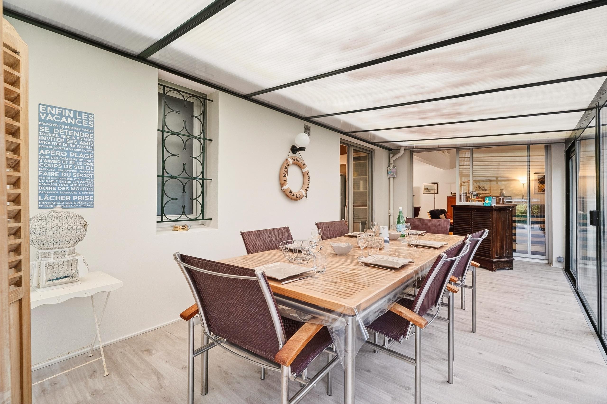 En el exterior, disfrutará de un jardín arbolado cerrado, ideal para compartir momentos de relajación al aire libre. Una terraza de 25 m² equipada con muebles de jardín y una barbacoa será perfecta para sus comidas de verano. La casa también cuenta con una gran terraza acristalada abierta al jardín, ofreciendo un espacio adicional para reunirse en cualquier época del año.