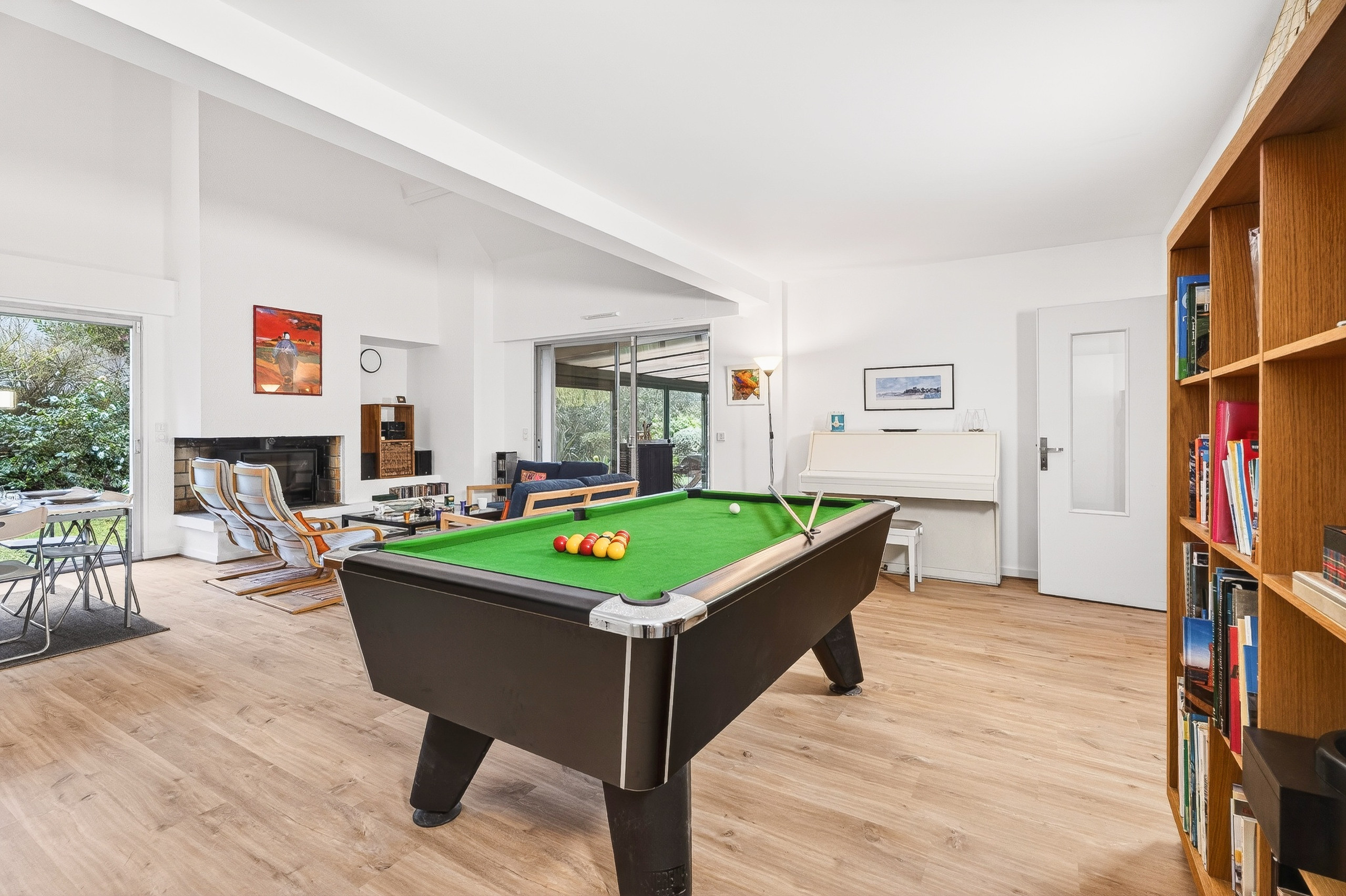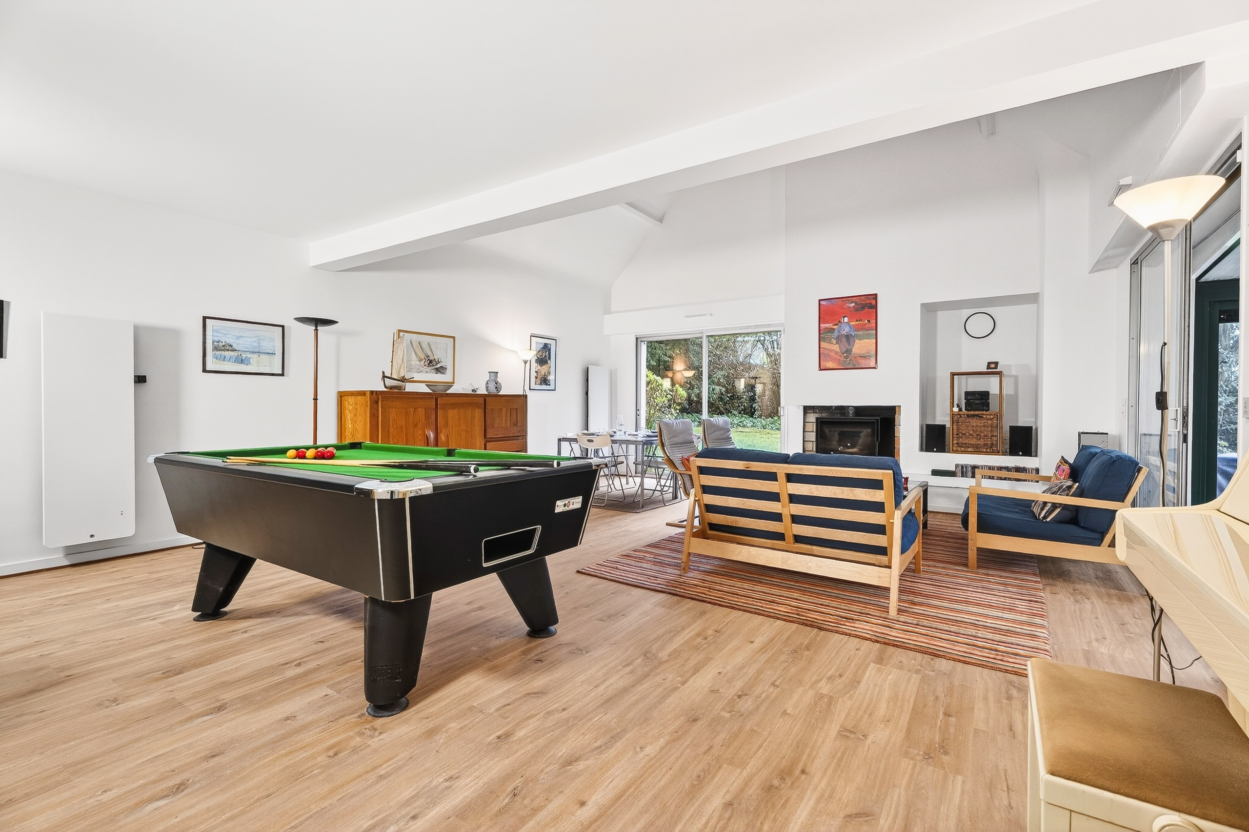 En el interior, nada más entrar, descubrirá una gran sala de estar acogedora y cálida. El salón se compone de dos sofás cómodos, dos sillones y una estufa de leña decorativa que aporta un toque cálido al conjunto. Para momentos de ocio, hay un billar y un piano a su disposición. Cerca, un espacio de comedor acoge una mesa que puede recibir hasta 6 personas. Un gran ventanal conduce directamente a la terraza donde encontrará una segunda mesa que puede acoger hasta 8 personas, así como una pequeña mesa redonda, ideal para compartir un café mientras se disfruta de la vista del jardín.