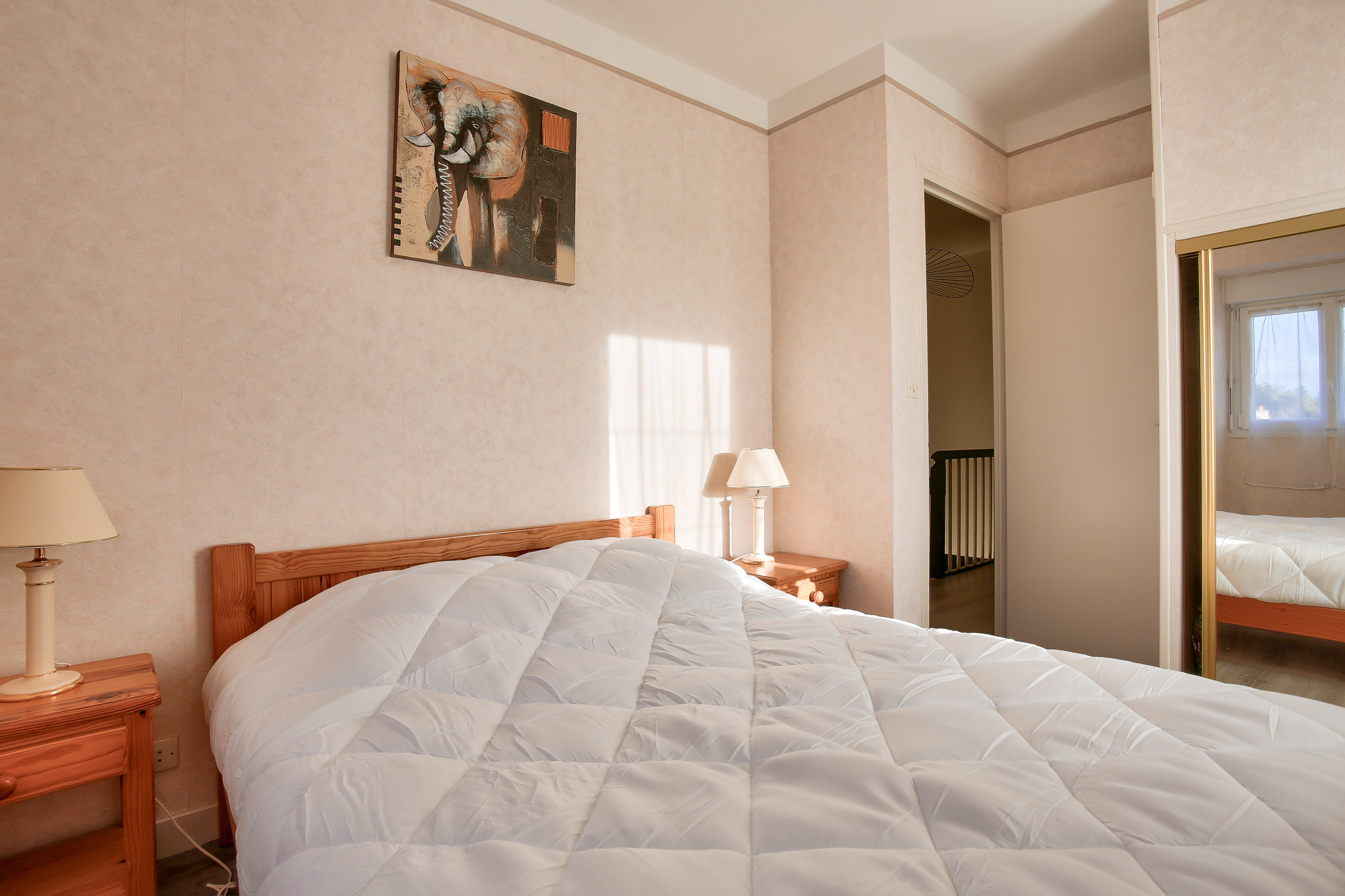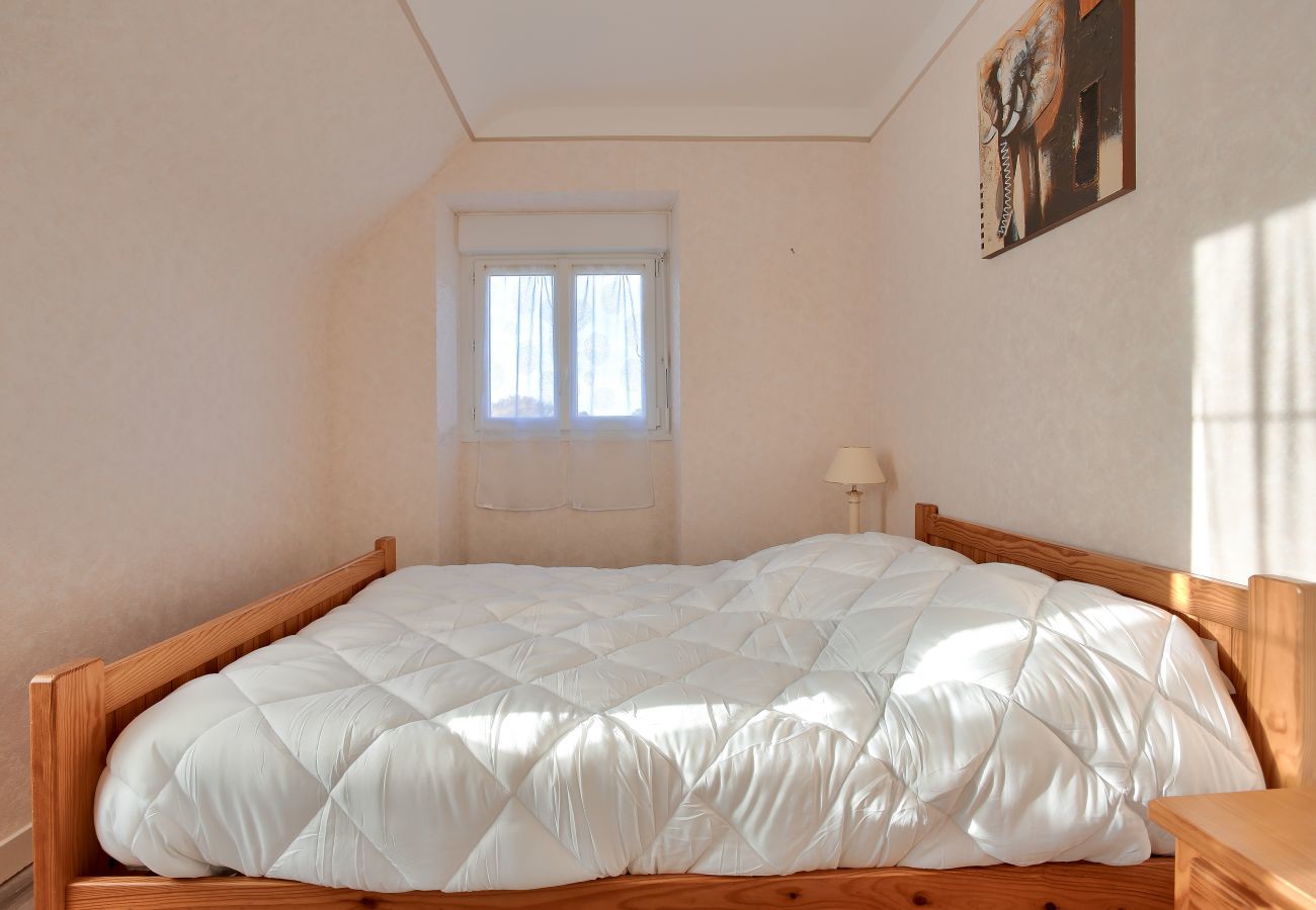 En la planta superior, descubrirá dos habitaciones, ambas con un punto de agua y un hermoso parqué que les confiere todo su encanto. La primera está equipada con una cama doble mientras que la segunda tiene dos camas individuales. Encontrará otros dos lugares para dormir en el salón desplegando el sofá.