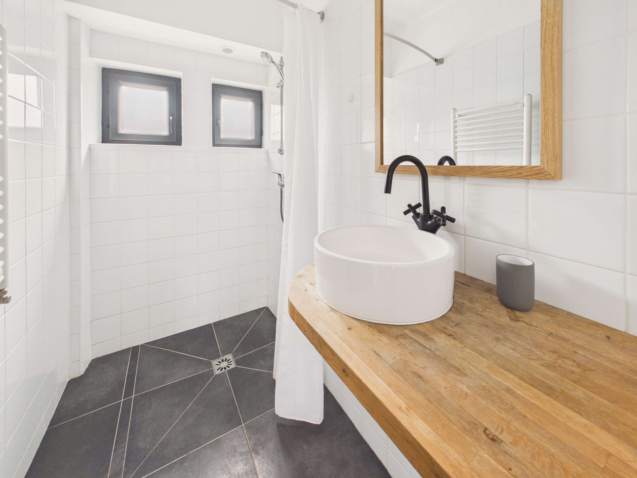 Siempre en la planta baja, encontrará una primera habitación con una cama King Size (180x200) y un cuarto de baño con aseo independiente. También hay un lavadero, equipado con una lavadora y un secadora.