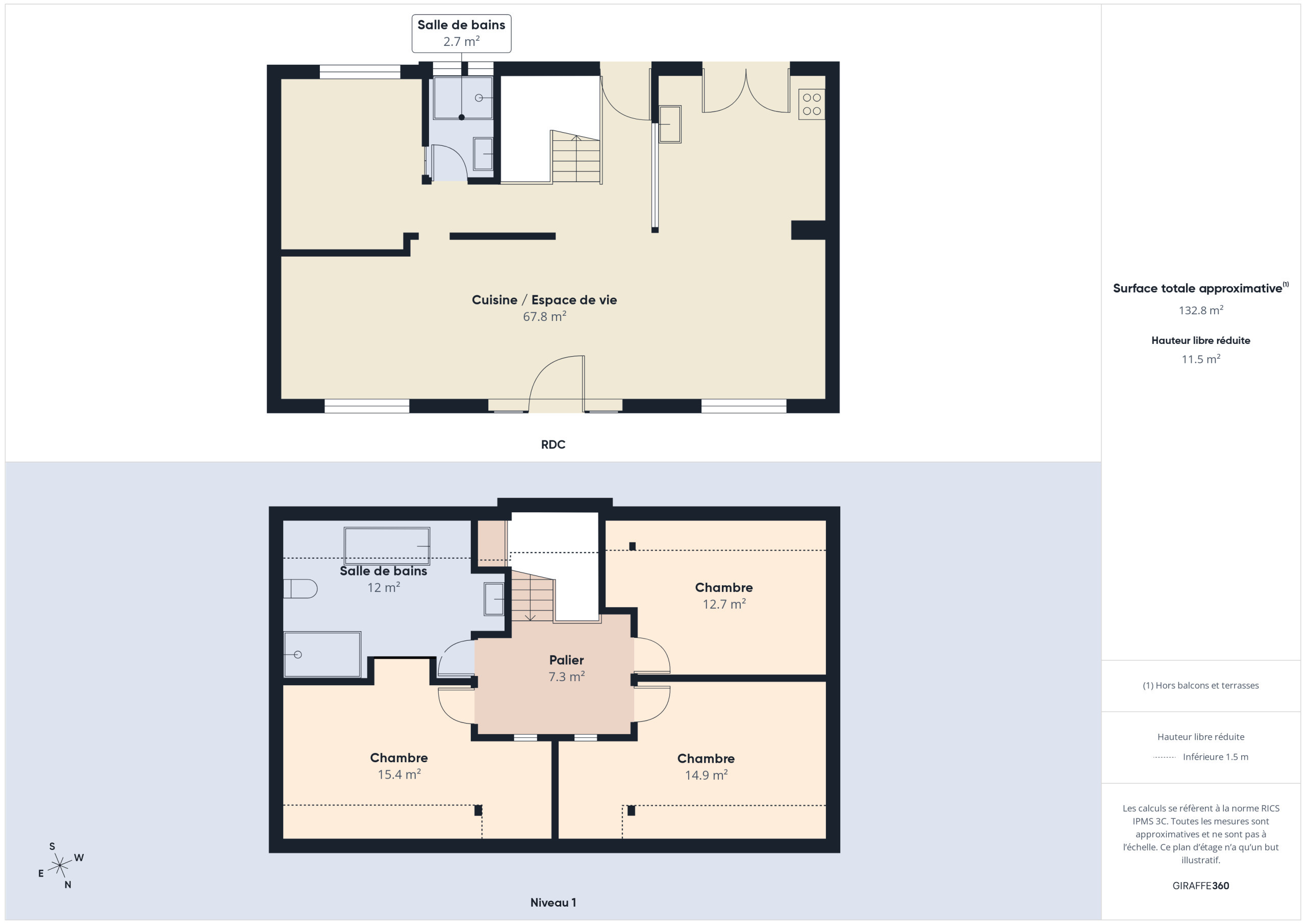 Encontrarás también 2 cuartos de baño: uno en la planta superior con bañera, ducha e inodoro, y otro en la planta baja con una ducha. Un segundo inodoro independiente completa la vivienda.