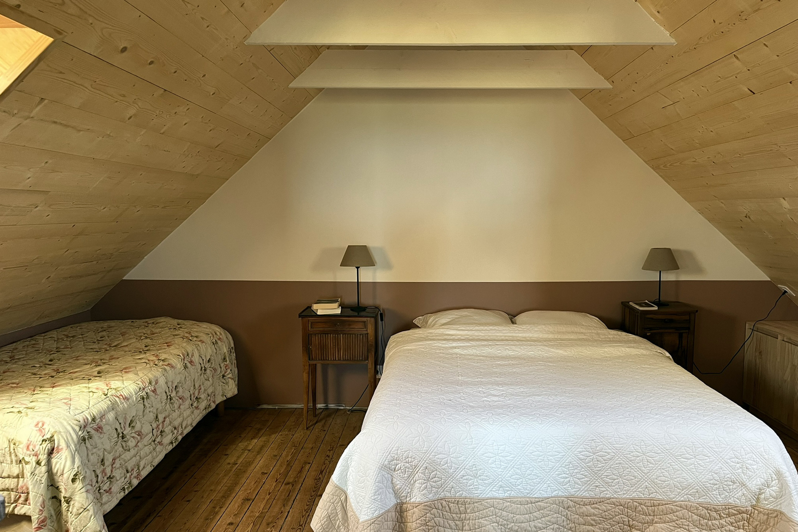 En la primera planta, encontrará un espacio de TV en red, ¡atención a los aventureros! En el lado nocturno, también encontrará dos suites dobles en esta planta: un dormitorio principal con cama King size (180x200) y una segunda habitación con una cama doble (140x190).