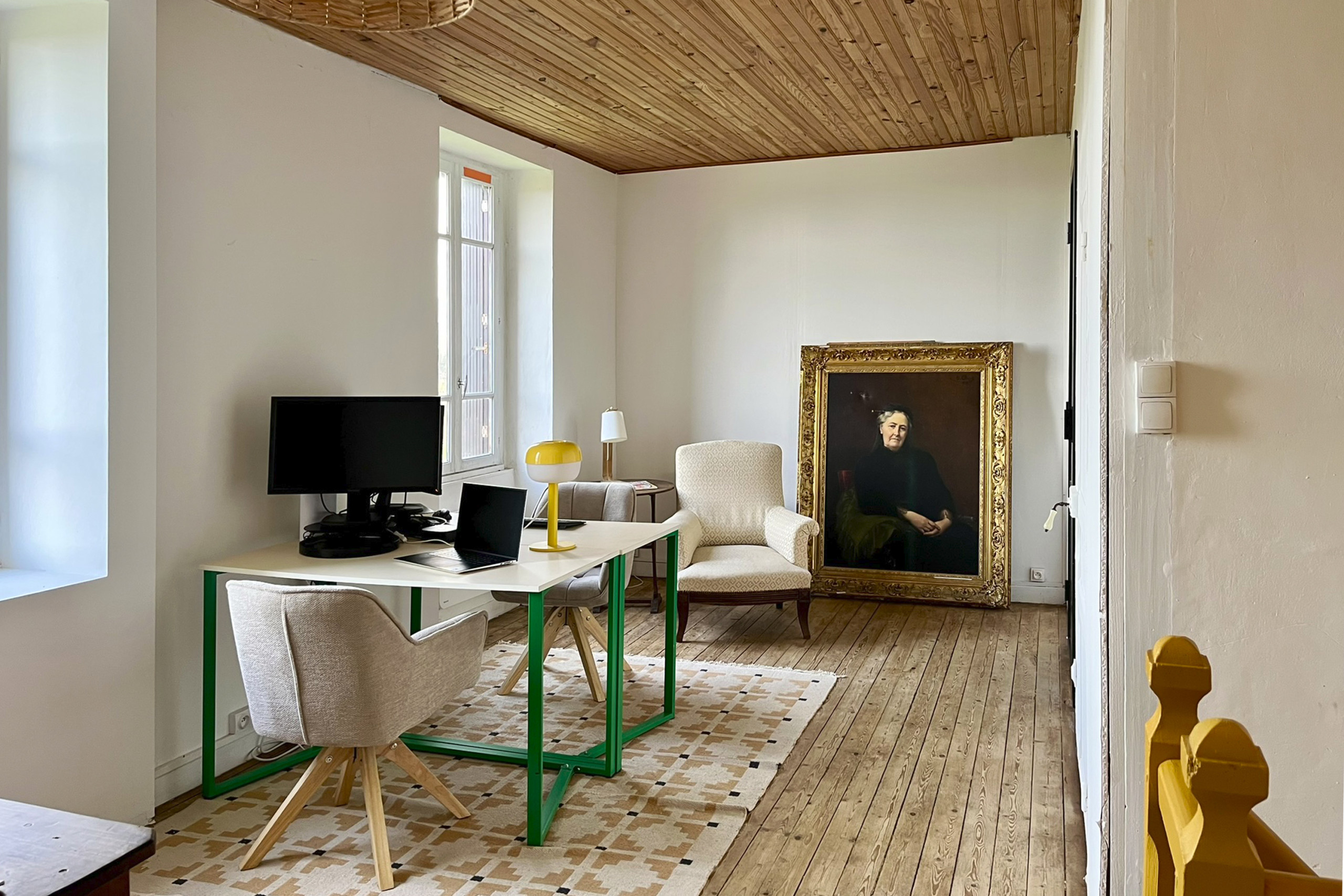 En la primera planta, también encontrará un amplio espacio con dos oficinas dedicadas al teletrabajo (2 pantallas disponibles) o a juegos y actividades creativas en familia, un baño con bañera (equipado con secador de pelo y toallero).