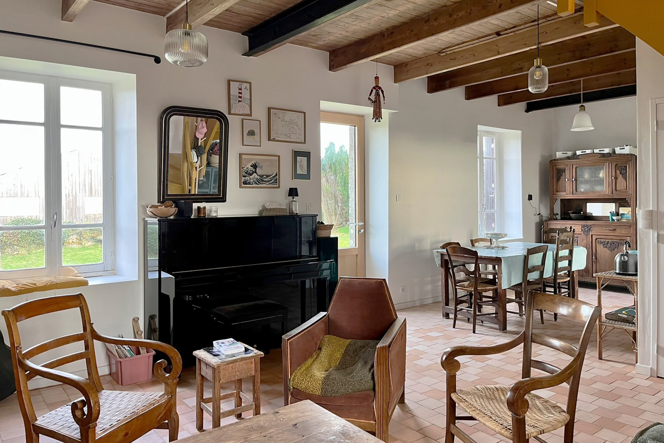 En el interior, una vez traspasada la puerta de entrada, descubre una amplia sala de estar acogedora. La cocina abierta, completamente equipada (refrigerador, congelador, placas de gas, horno, lavavajillas), le permitirá preparar sus comidas como en casa. Para el desayuno, dispondrá también de una hervidor, una tostadora y una cafetera de filtro. Por la noche, relájese en el sofá de la sala, junto a la estufa, con estanterías llenas de libros, y para los músicos, un piano, una guitarra...