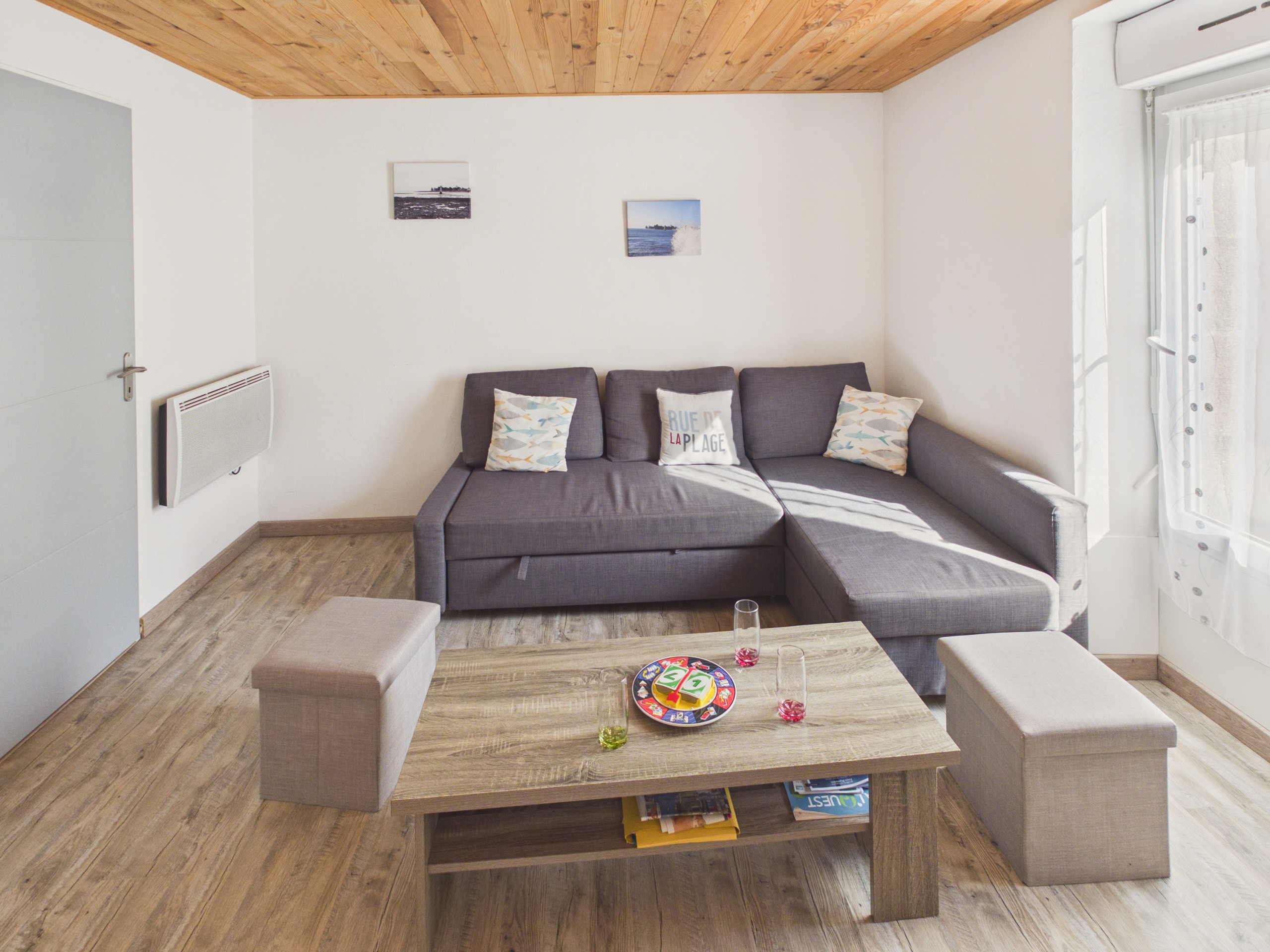 Aquí, muy cerca de la playa y del puerto podrá disfrutar de unas vacaciones relajantes en la isla Tudy! Esta casa con toques bretones y azulados le acoge para una estancia de hasta 6 personas! Su salón - comedor será perfecto para sus reuniones familiares o entre amigos alrededor de una buena comida o de una película en la televisión. Después, encontrará una cocina bien equipada con una pequeña abertura hacia el comedor, que incluye una placa de inducción, un refrigerador, un microondas, un horno, un congelador, un lavavajillas, una cafetera de filtro, una tostadora y una tetera.