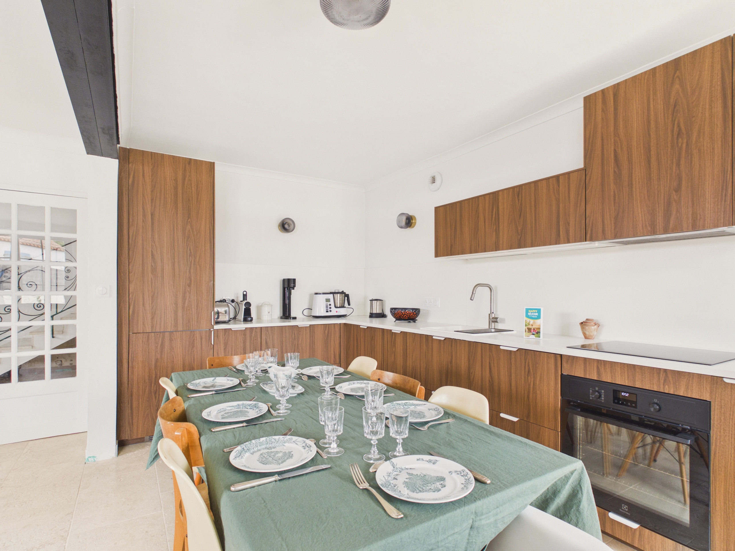 En el interior, nada más entrar, descubrirá una hermosa sala de estar acogedora y agradable. A la derecha, el salón está equipado con un sofá cómodo, dos sillones y un televisor, así como una chimenea decorativa que aporta un toque de encanto al conjunto. El espacio del comedor cuenta con una gran mesa que puede acoger hasta 8 personas para compartir sus comidas de manera muy acogedora. La cocina americana, moderna y funcional, está completamente equipada: placas de inducción, frigorífico, congelador, horno, microondas, robot de cocina Monsieur Cuisine, lavavajillas, cafeteras de filtro y Nespresso, tostadora, hervidor, así como todos los utensilios necesarios para cocinar como en casa.