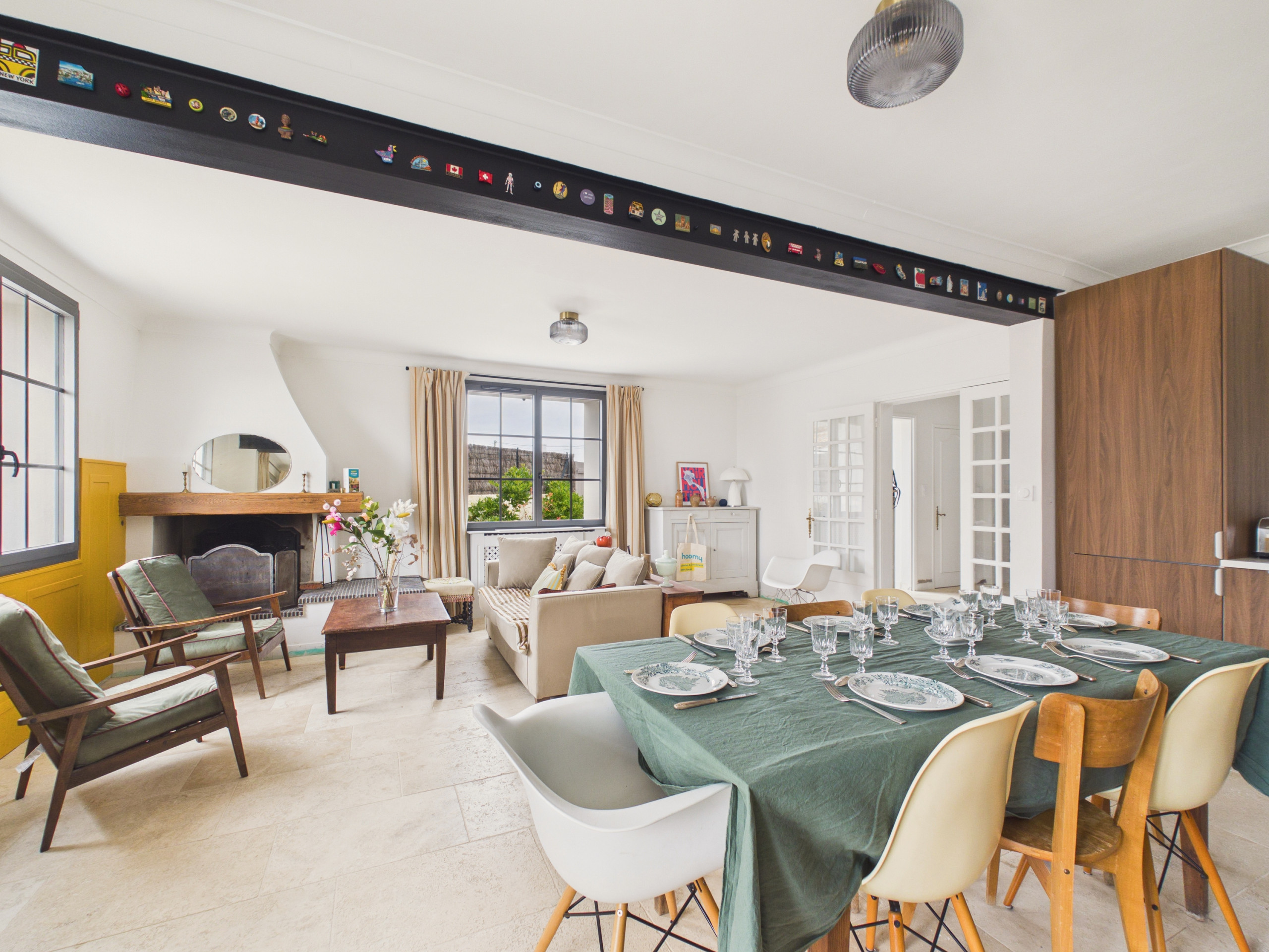 En el interior, al entrar en la casa, descubrirá una hermosa sala de estar cálida y luminosa. El salón está amueblado con dos sofás cómodos, dos sillones, un televisor y una chimenea, ofreciendo un espacio acogedor para reunirse después de un día en la playa. El espacio de comedor contiguo cuenta con una gran mesa que puede acomodar hasta 8 personas. Justo al lado, la cocina semiabierta e independiente está completamente equipada: placas de inducción, refrigerador, microondas, horno, lavavajillas, cafetera de filtro, tostadora, hervidor y todo lo necesario para preparar sus comidas como en casa.