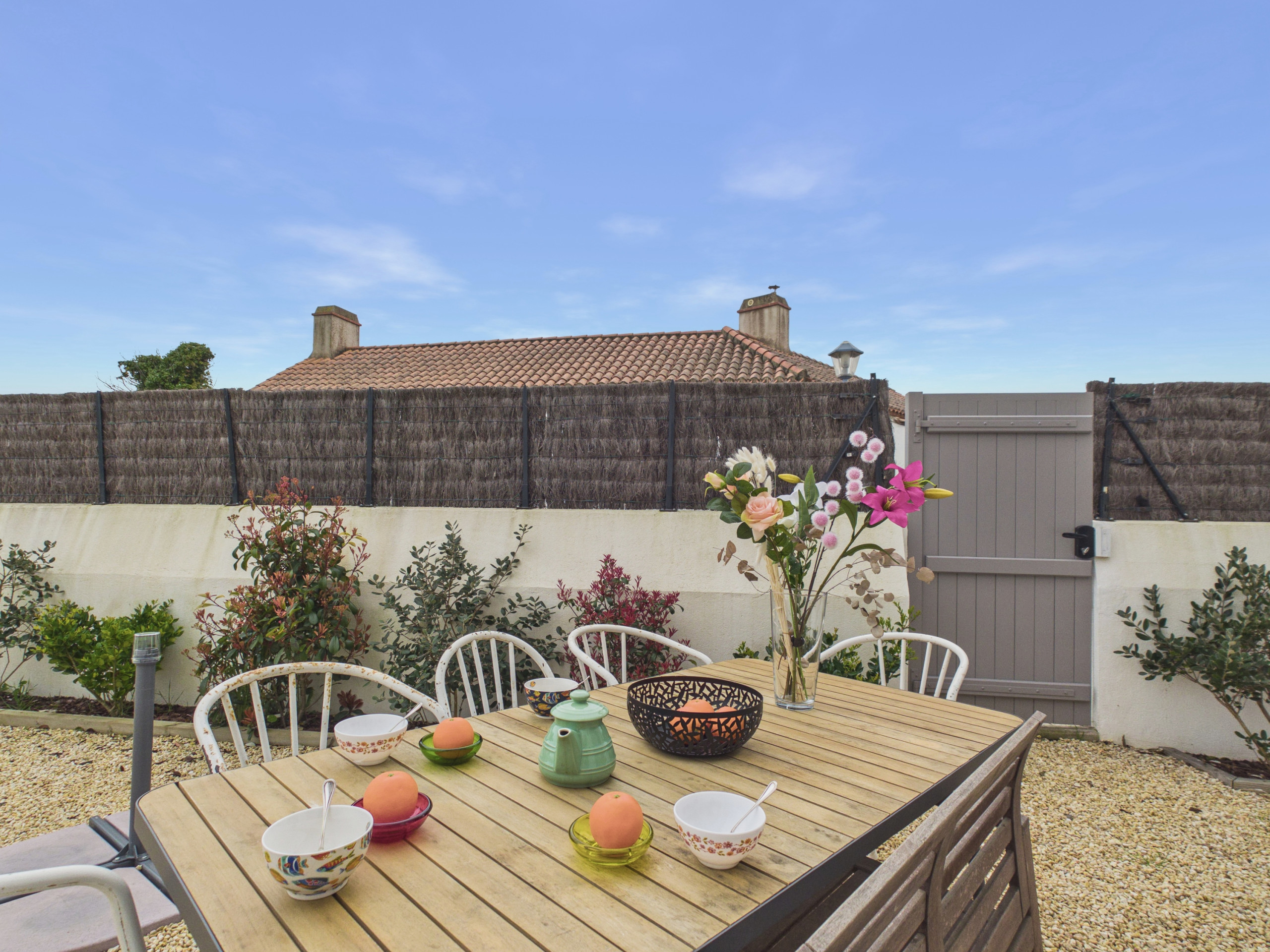 En el exterior, el jardín vallado representa un verdadero activo para las familias, ofreciendo un espacio seguro donde los niños pueden jugar libremente. Podrá disfrutar de momentos de relajación en familia en la terraza con el mobiliario de jardín y reunirse alrededor de la plancha para saborear buenos asados estivales.