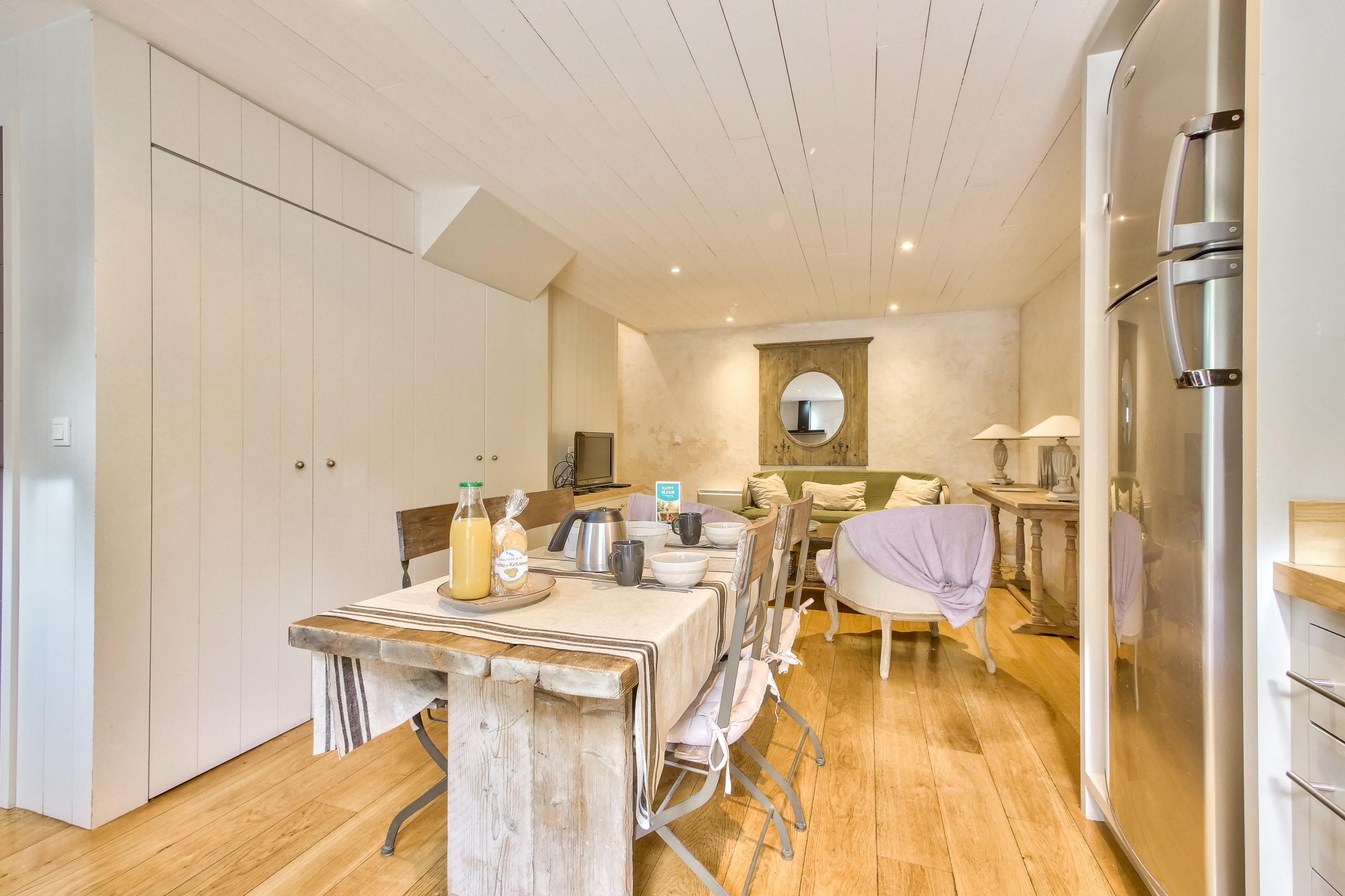 Este acogedor capullo está bellamente decorado y le abre sus puertas a un espacio de vida completamente abierto. La cocina moderna, equipada con placas vitrocerámicas, un refrigerador, un microondas, un horno, un congelador, un lavavajillas, una cafetera, una tostadora y un hervidor, se abre a la sala de comedor donde podrá compartir una comida en pareja.