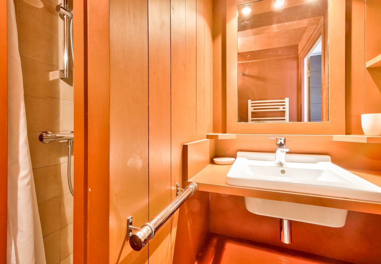 El alojamiento también cuenta con un cuarto de baño con tonos naranjas, equipado con un secador de pelo, así como un aseo independiente.