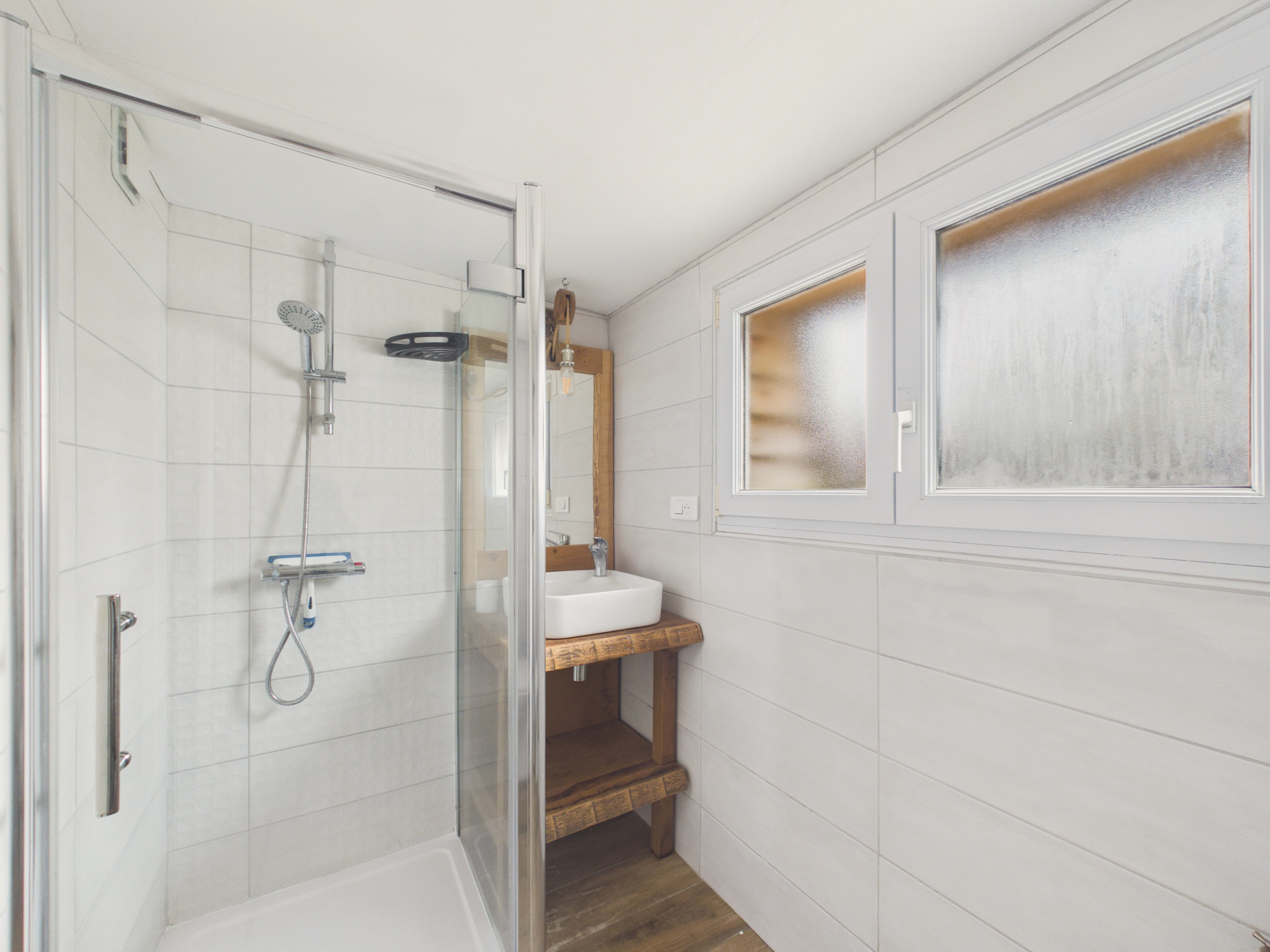En la zona de noche, la casa cuenta con dos habitaciones confortables. La primera está equipada con una cama Queen Size (160x200) y un pequeño armario abierto. La segunda, ideal para niños o una segunda pareja, ofrece dos camas individuales (90x200) que pueden unirse para formar una gran cama King Size (180x200), así como un gran armario con vestidor. Un cuarto de baño moderno con una gran ducha italiana y un secador de pelo completa la zona de noche.