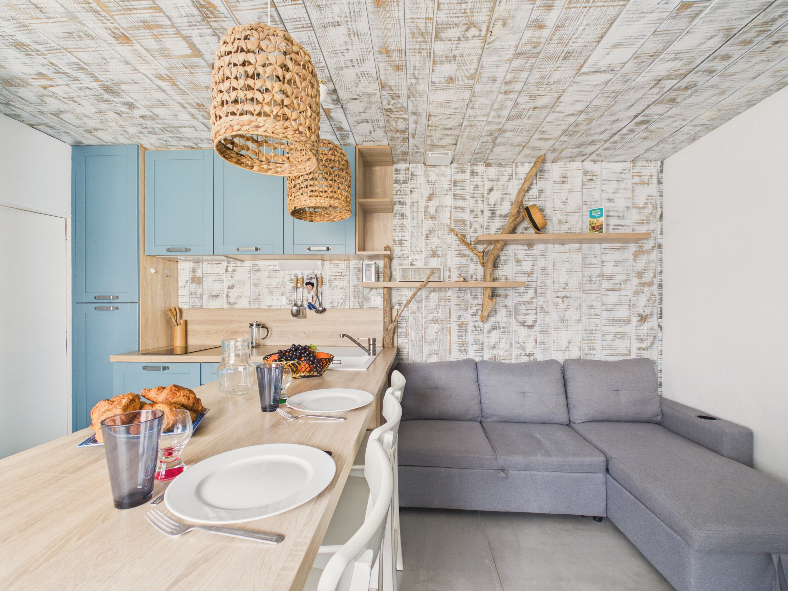 Al entrar en la casa, descubrirá una hermosa sala de estar acogedora y luminosa, abierta a un gran ventanal corredera que da a la terraza de madera. El salón, decorado con esmero, le invita a relajarse después de un día junto al mar, mientras que la cocina americana de inducción está completamente equipada para preparar deliciosas comidas: nevera, congelador, horno, microondas, lavavajillas, cafetera Nespresso, tostadora y hervidor. Todo está pensado para que se sienta como en casa.