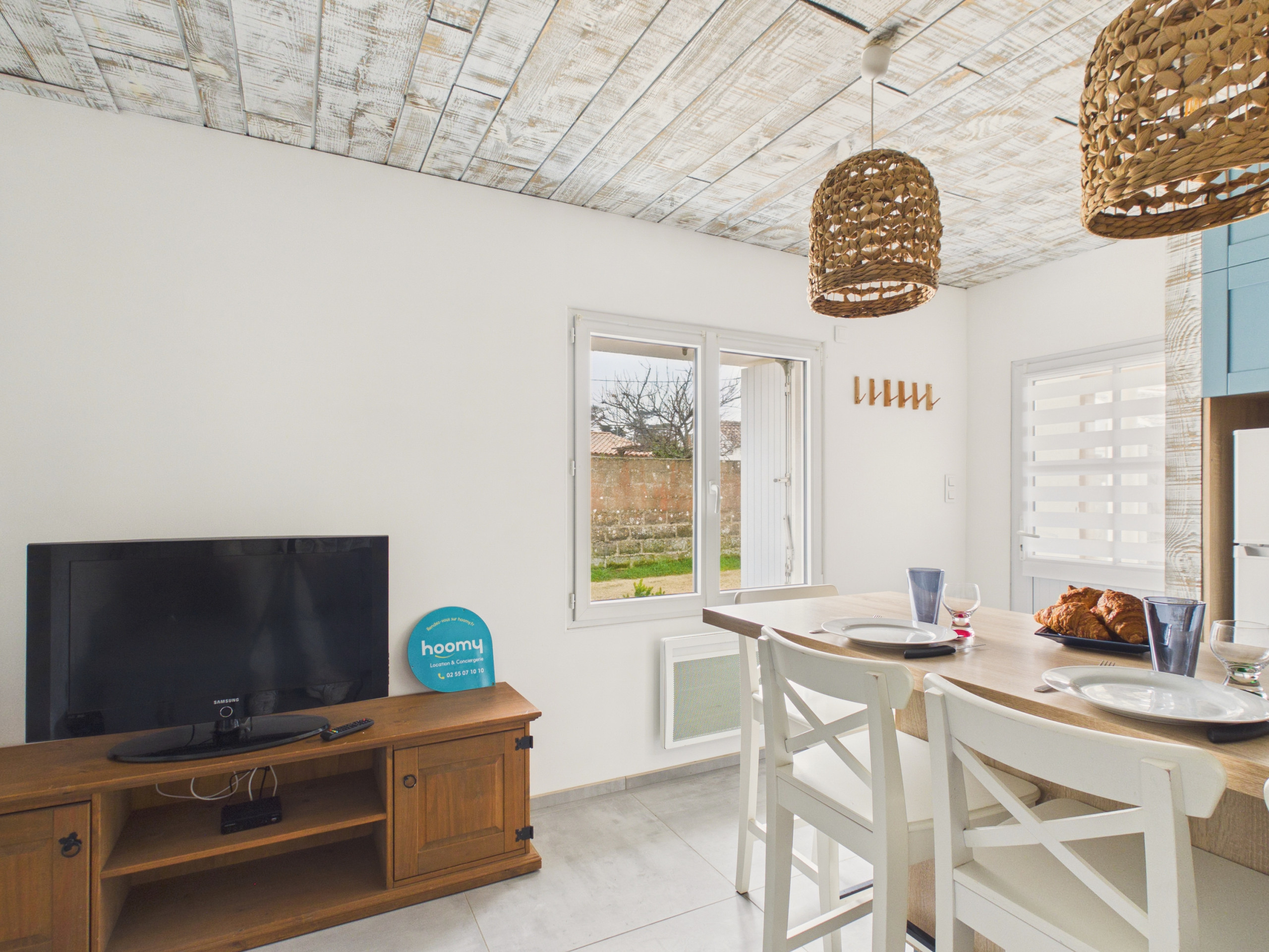 La entrada a la casa se hace directamente por la sala de estar. Descubrirá un espacio de salón acogedor amueblado con un sofá cómodo y una televisión, ideal para sus momentos de relajación. Justo al lado, la cocina americana abierta, de inducción, dispone de una mesa que puede acoger a 2 personas. Está equipada con un frigorífico, un microondas combinado con grill, una cafetera de filtro, una tostadora, una hervidor así como todo lo necesario para cocinar de manera sencilla durante su estancia.