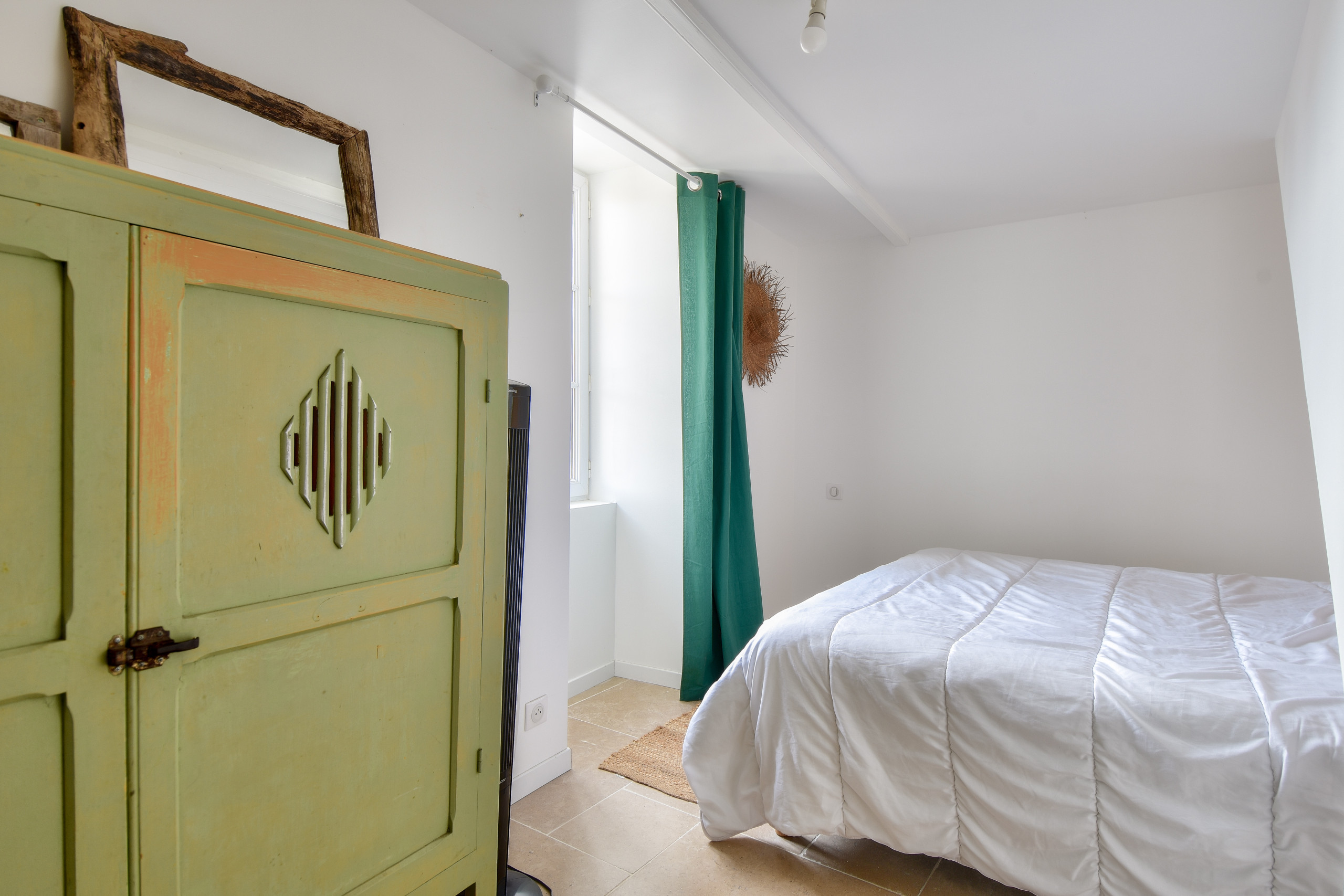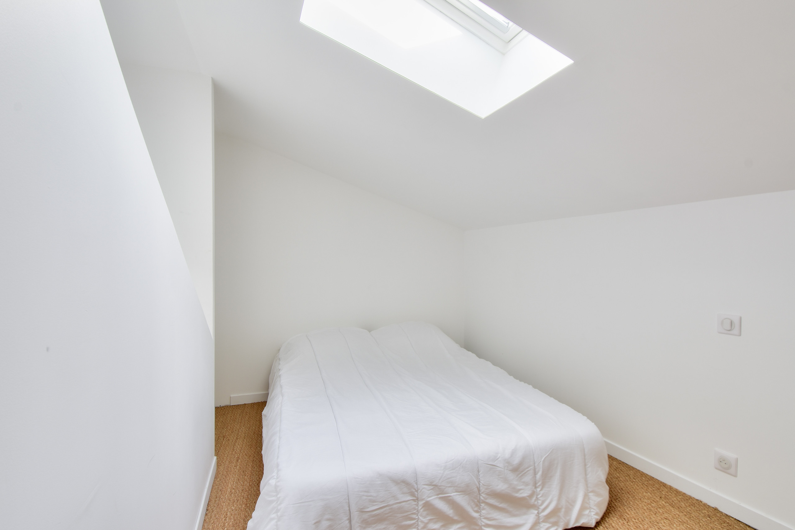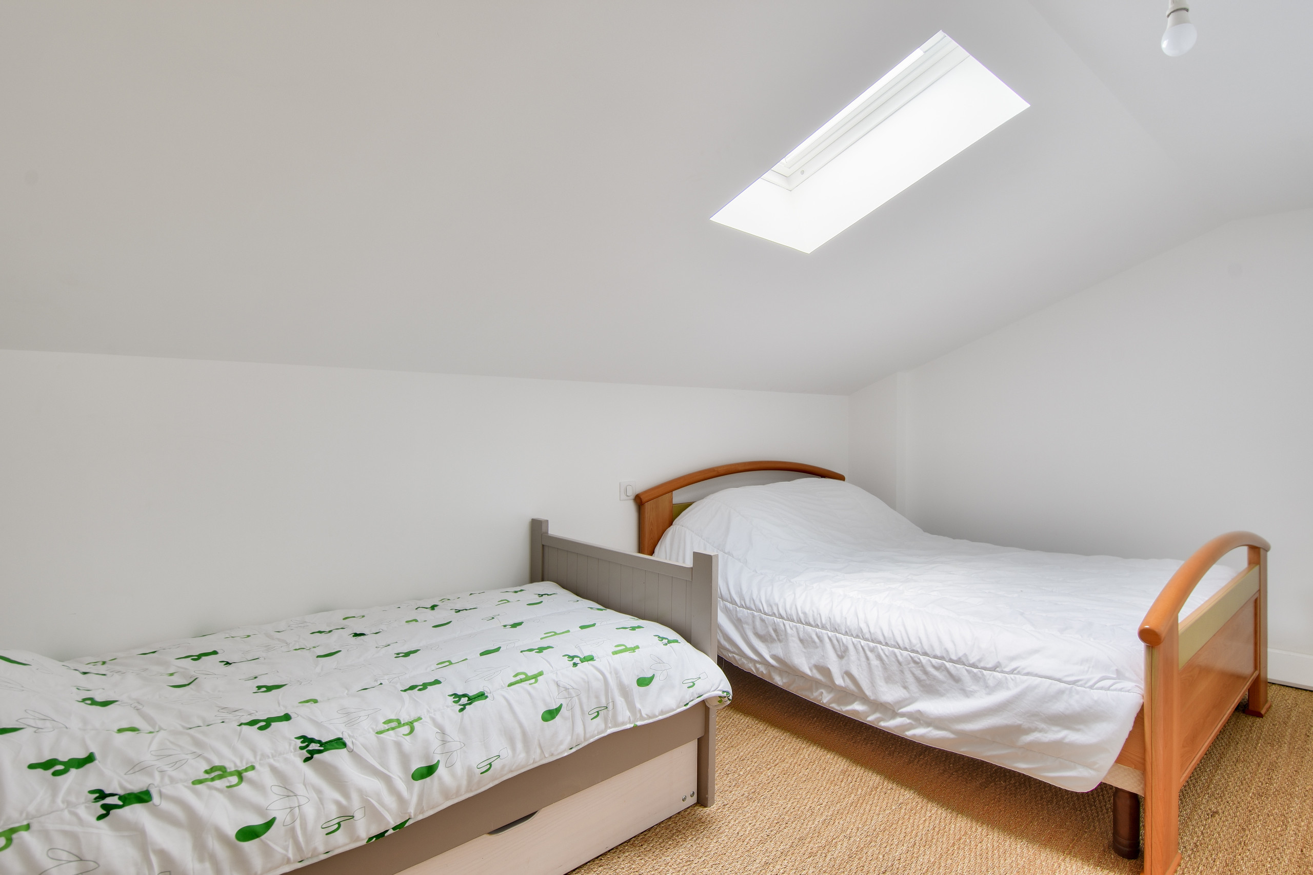 Por la noche, descubrirá tres habitaciones. En la planta baja, la primera habitación, abuhardillada y decorada en tonos grises, dispone de una cama queen-size, ofreciendo un verdadero capullo para una buena noche de descanso. En la planta superior, encontrará una habitación con una cama doble y una habitación con una litera para tres personas, que incluye un espacio para dormir doble abajo y una cama individual arriba.
