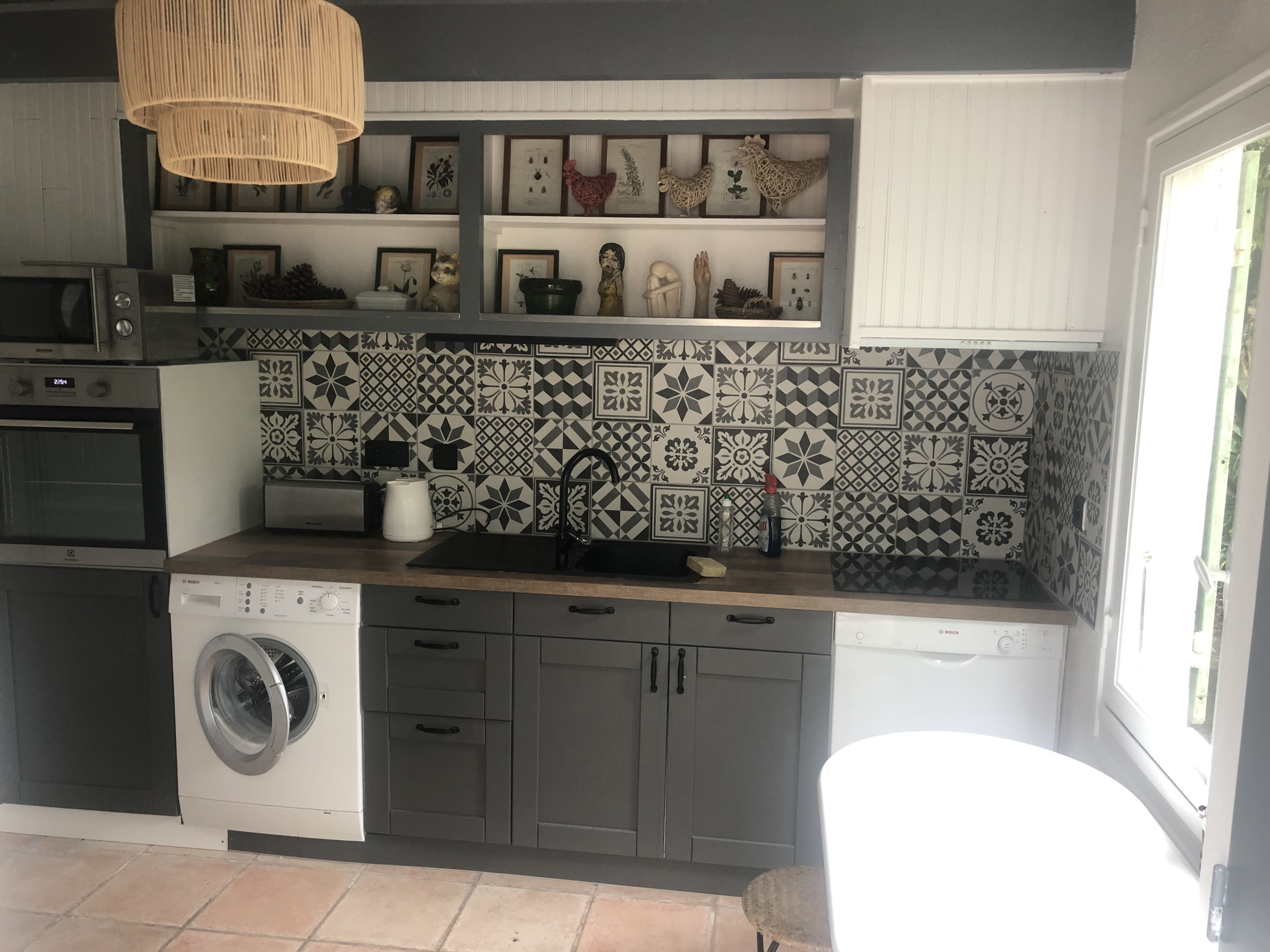 Contigua al espacio de estar, la cocina americana está perfectamente equipada: refrigerador, microondas, horno, congelador, lavavajillas, placas vitrocerámicas, cafetera de filtro y Nespresso, tostadora y hervidor. Una pequeña mesa integrada permite tomar un desayuno rápido antes de salir a explorar la isla.