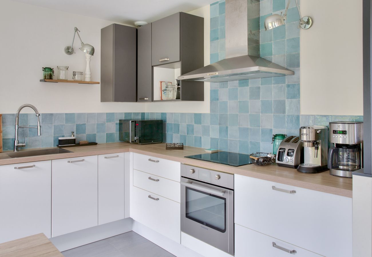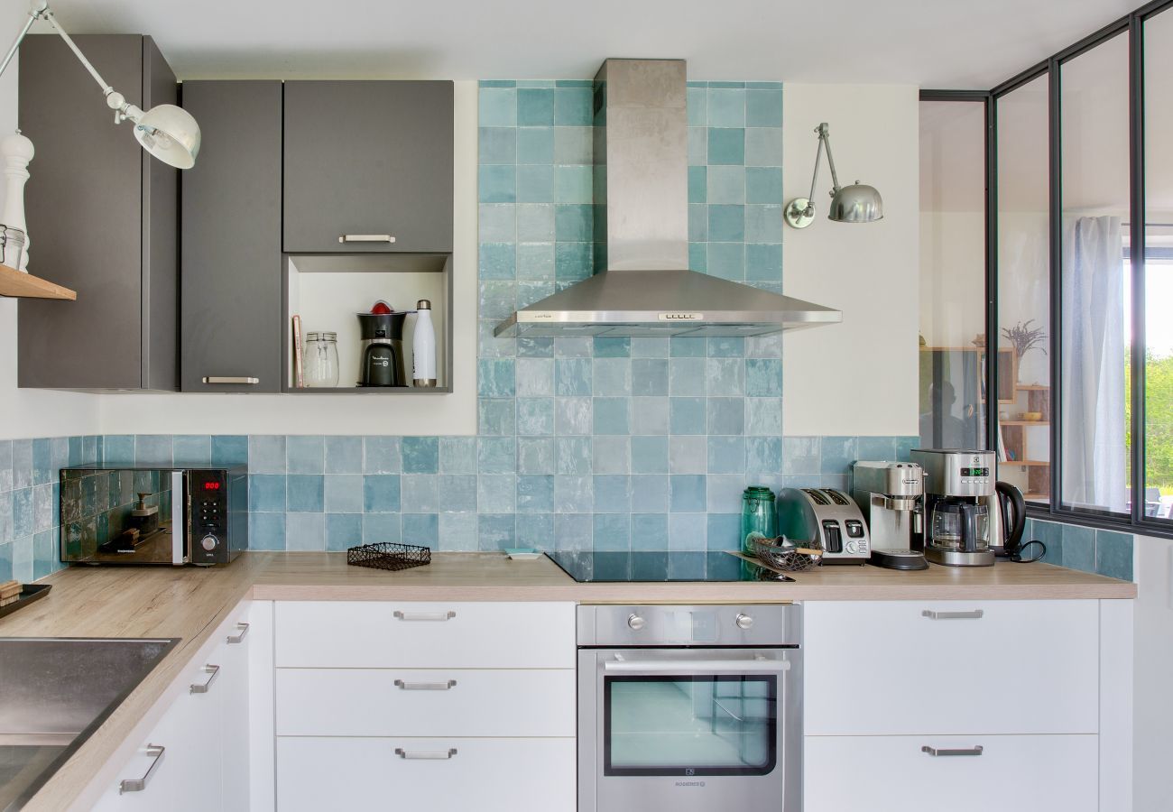 Empuja la puerta principal y déjate seducir por esta casa moderna y luminosa. Después de cruzar el pasillo, descubrirá una gran y cálida sala de estar con acceso directo a la terraza. La cocina abierta, contemporánea y totalmente equipada (nevera, congelador, horno, microondas, lavavajillas) ofrece todo lo que necesita para preparar deliciosas comidas. Para el desayuno, también encontrará una cafetera de filtro, una Tassimo, una tetera y una tostadora. Las comidas se pueden compartir alrededor de la mesa de comedor interior para 8 personas o al aire libre en la terraza, perfecta para los días soleados. La sala de estar, con sus cómodos sofás, mesa de café y TV, es ideal para relajarse por las tardes.