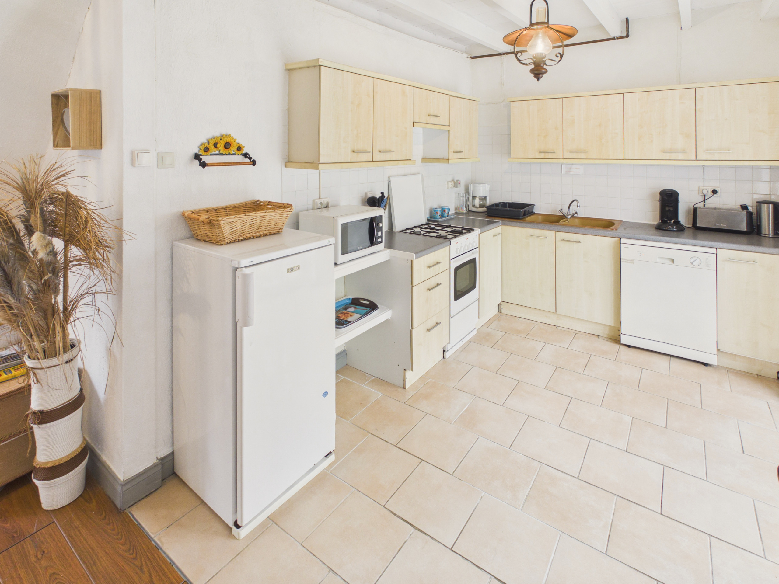 La cocina, abierta a la sala de estar y equipada (placa de cocción a gas, refrigerador, microondas, horno, congelador), pone a su disposición todo lo necesario para preparar sus comidas. Para el desayuno, encontrará una tetera, una tostadora así como una cafetera Senseo.