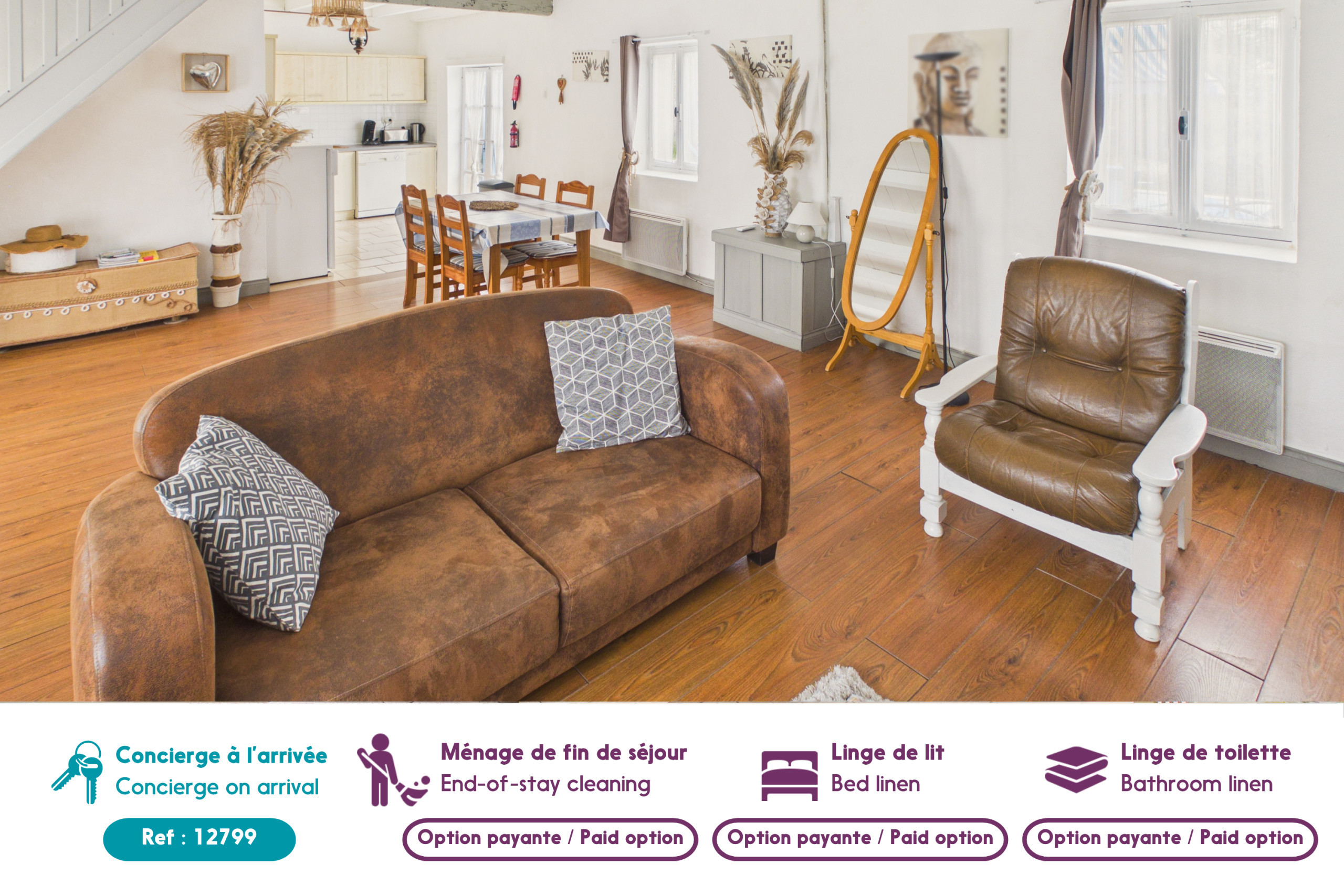La ropa de hogar y la limpieza de fin de estancia se ofrecen como opción, según el nivel de confort deseado. La ropa se proporciona a su llegada para toda la duración de la estancia (sin renovación). La limpieza durante la estancia no está incluida en nuestros servicios.