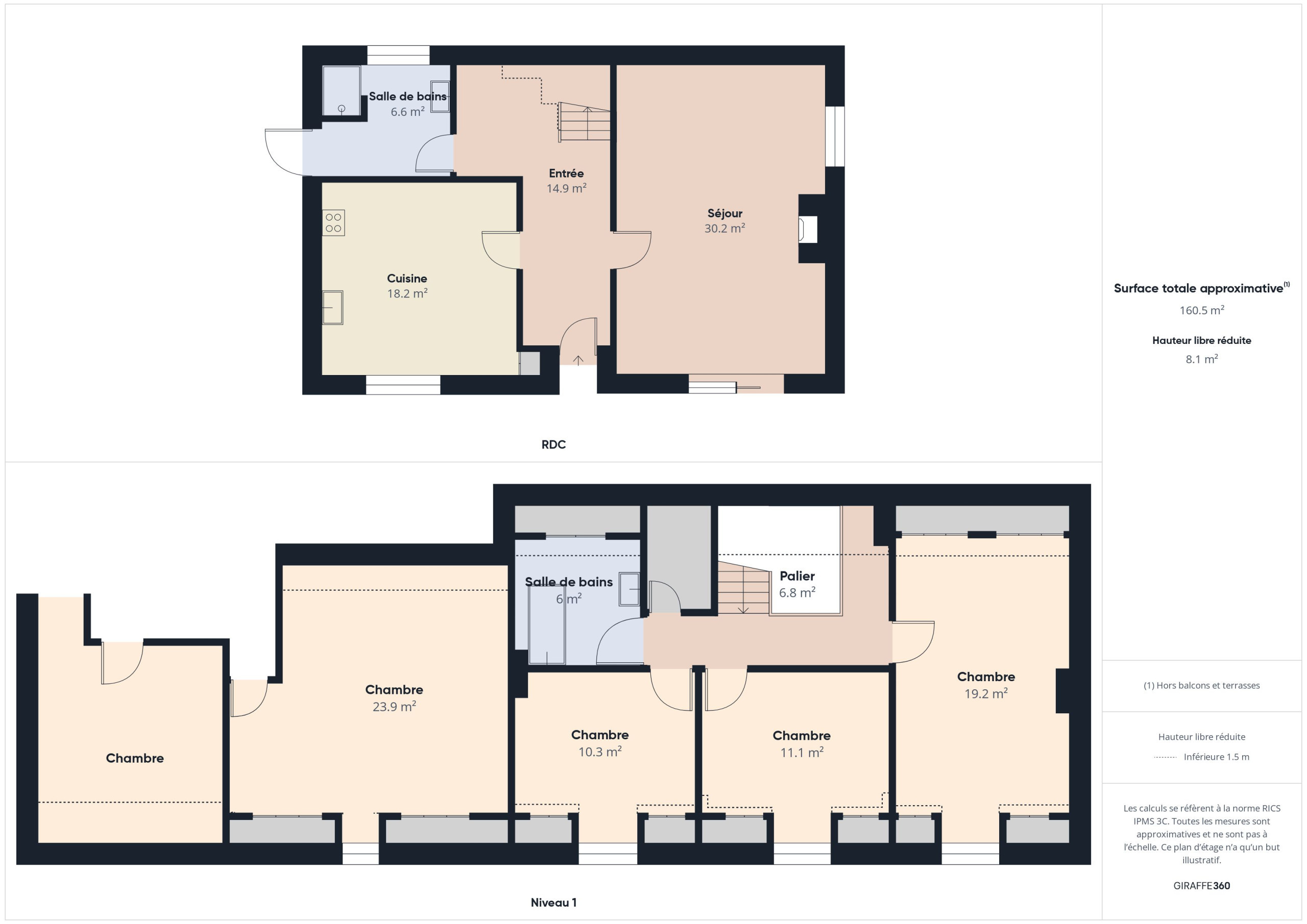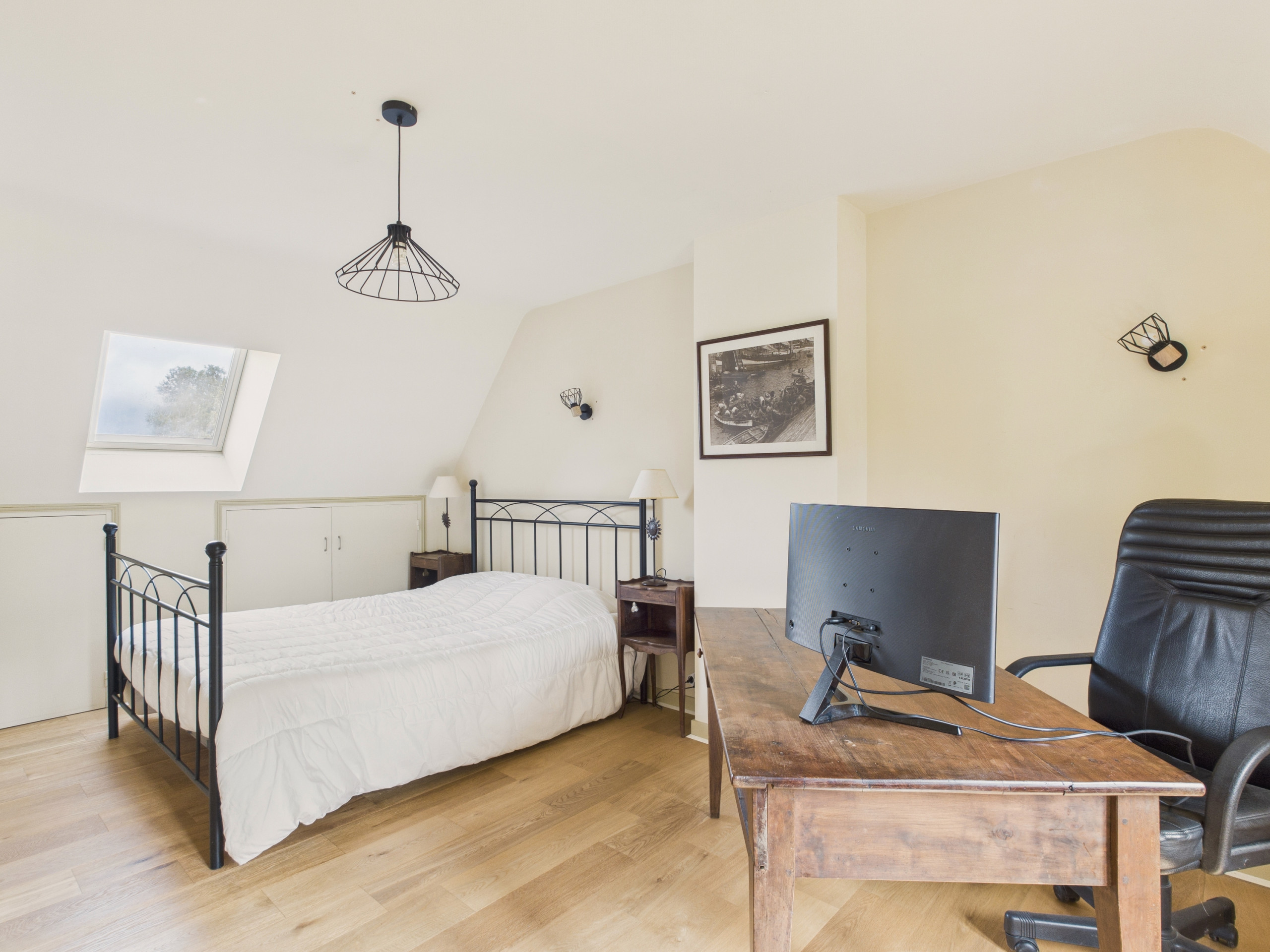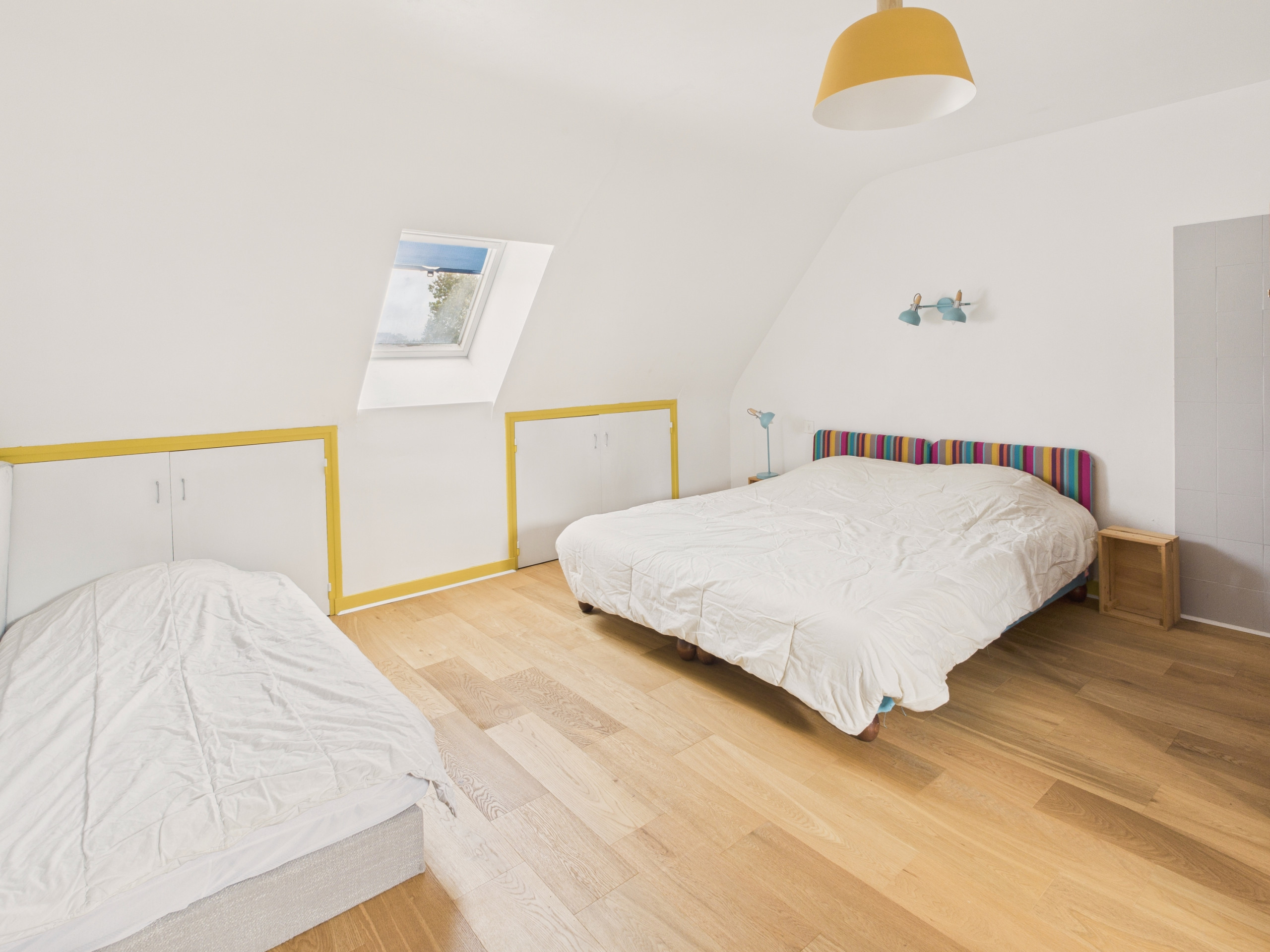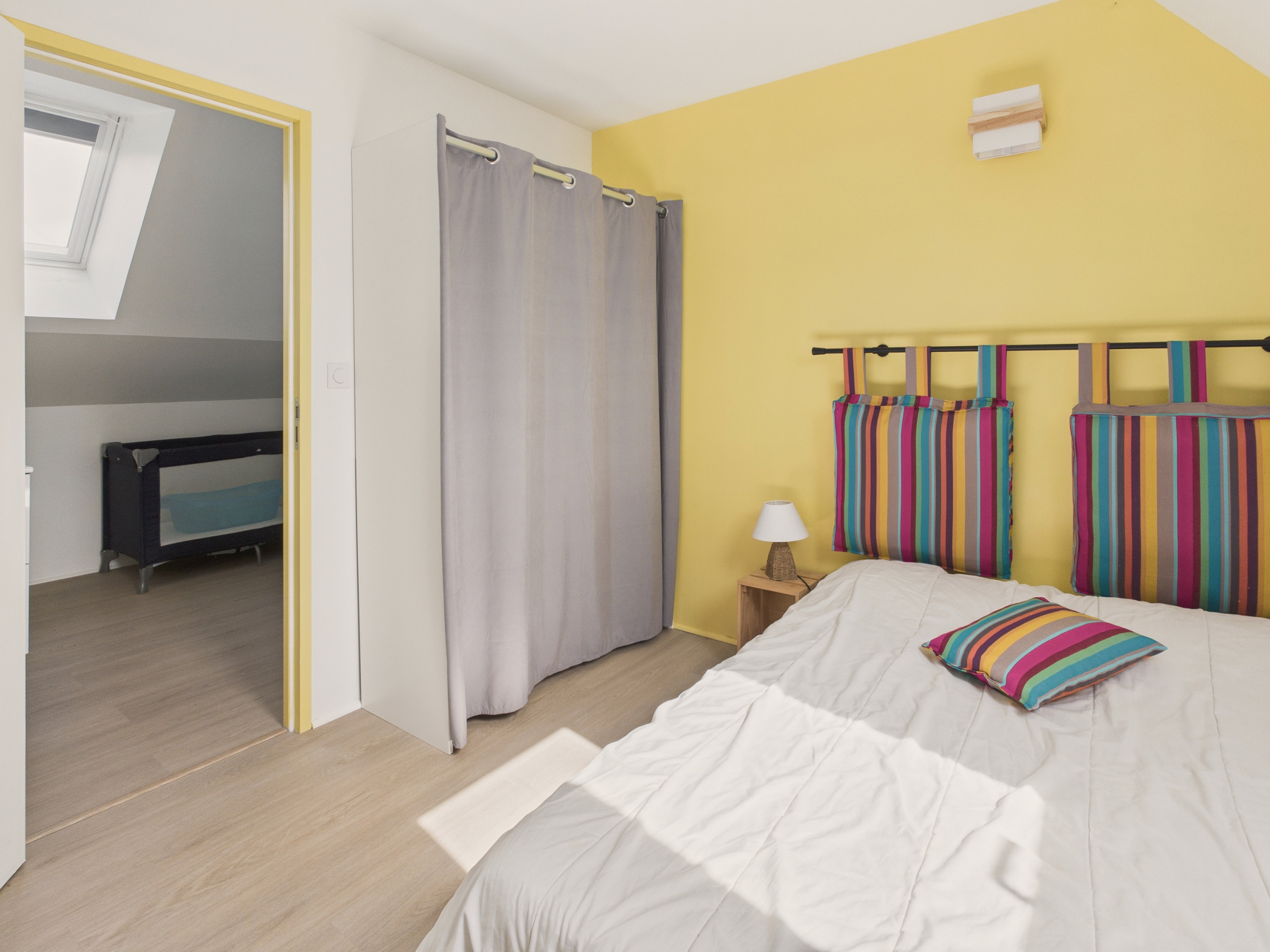 Las habitaciones se encuentran en el piso que se divide en 2 partes. Las tres primeras son accesibles por la escalera de la entrada, la primera dispone de una cama Queen Size (160x200cm) y un escritorio, la segunda de una cama doble (140x190cm) y la tercera de dos camas individuales (90x190cm). Del otro lado, una cuarta habitación con una cama Queen Size (160x200cm) y una cama individual (90x190cm) es accesible a través de la escalera del garaje. Así como una quinta habitación con una cama doble (140x190cm) y su cuarto de baño contiguo con WC accesible a través de una escalera en el exterior.