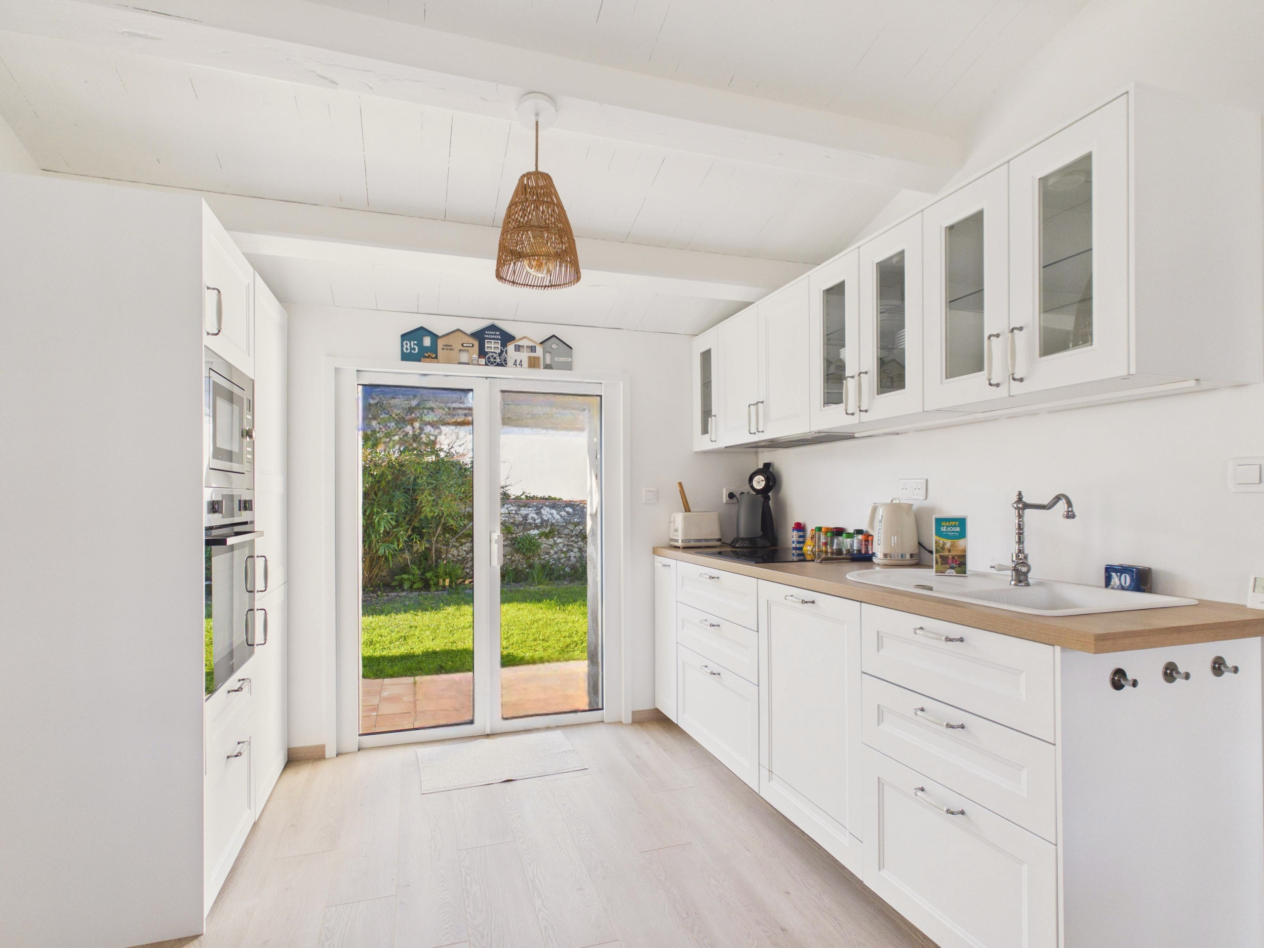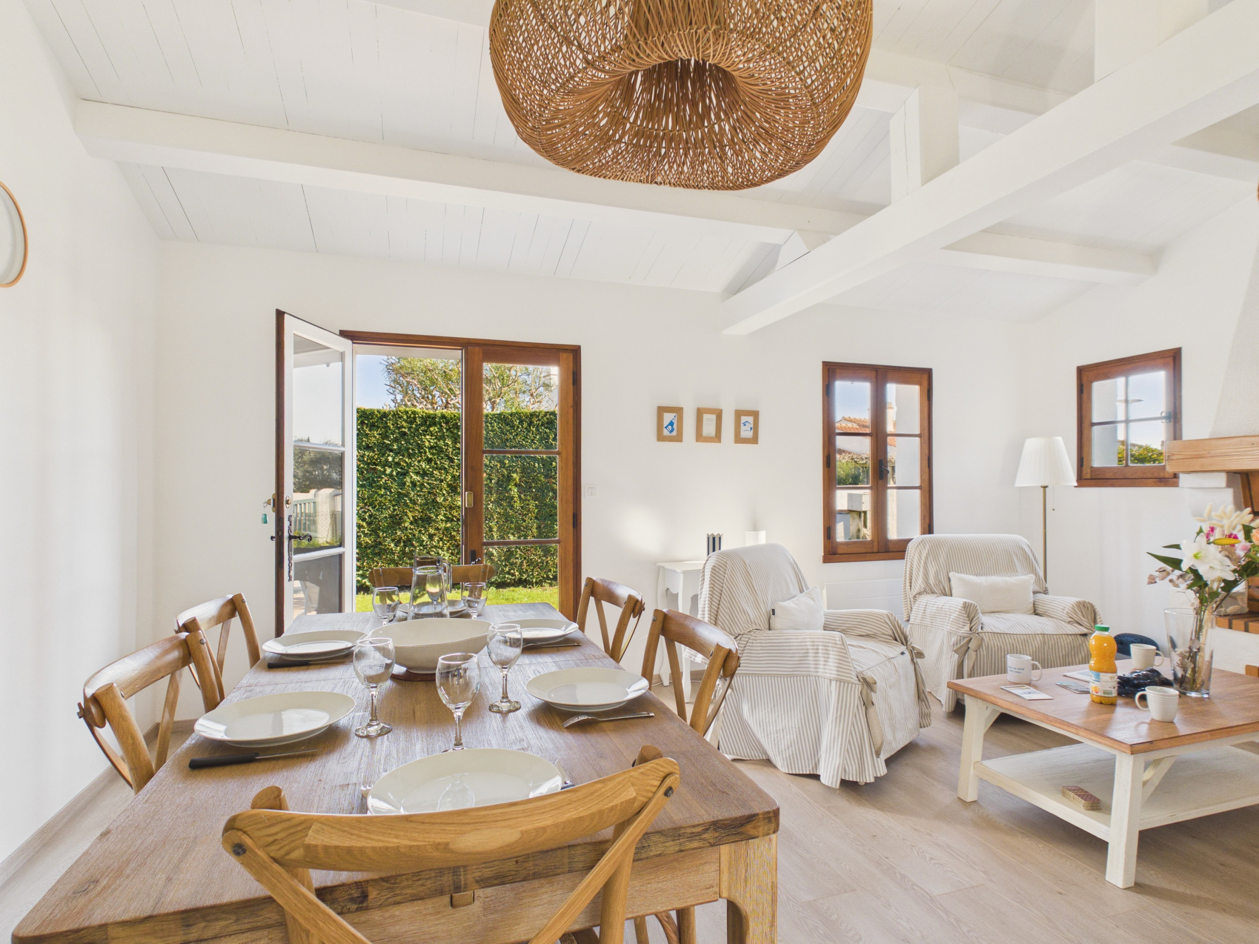 En el interior, la entrada se abre directamente a una hermosa sala de estar acogedora. El salón cuenta con un sofá, dos sillones y un televisor, ofreciendo un espacio cómodo para reunirse en familia después de un largo día de exploración en la isla. Contigua pero independiente, la cocina con placas vitrocerámicas está completamente equipada: refrigerador/congelador, microondas, horno, lavavajillas, cafetera de filtro y Nespresso, tostadora, hervidor y todo lo necesario para cocinar. También dispone de una mesa que puede acoger cómodamente de 6 a 8 personas para compartir sus comidas.