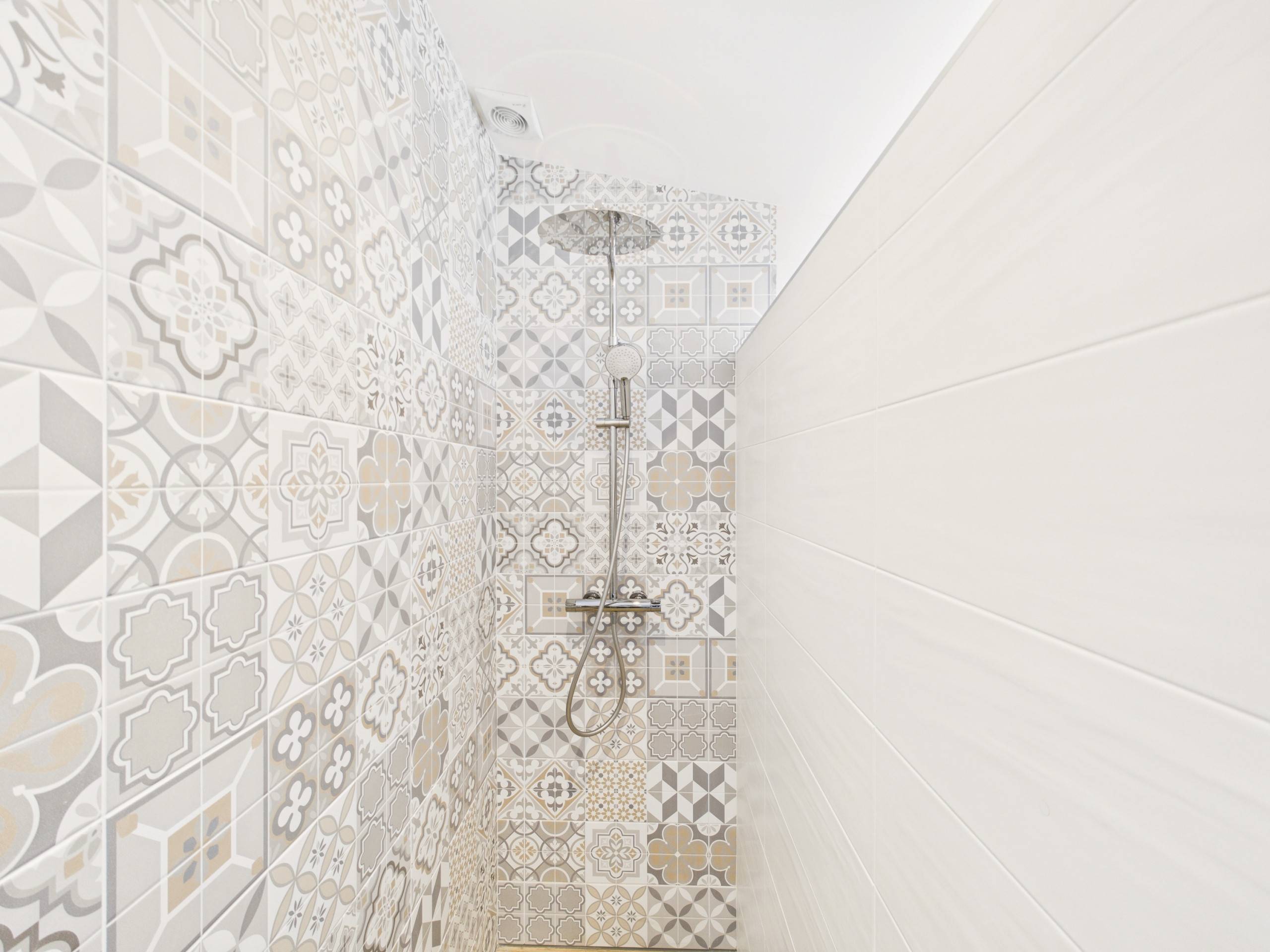El cuarto de baño, situado en la planta baja, cuenta con una ducha, inodoro y secador de pelo.