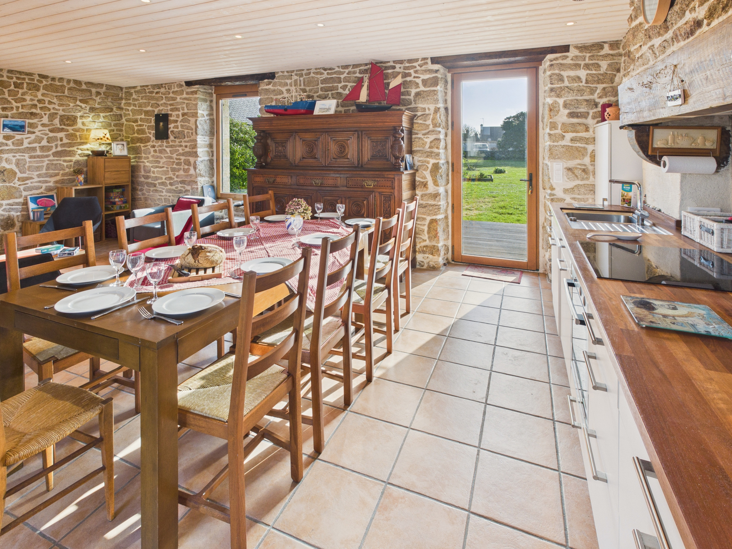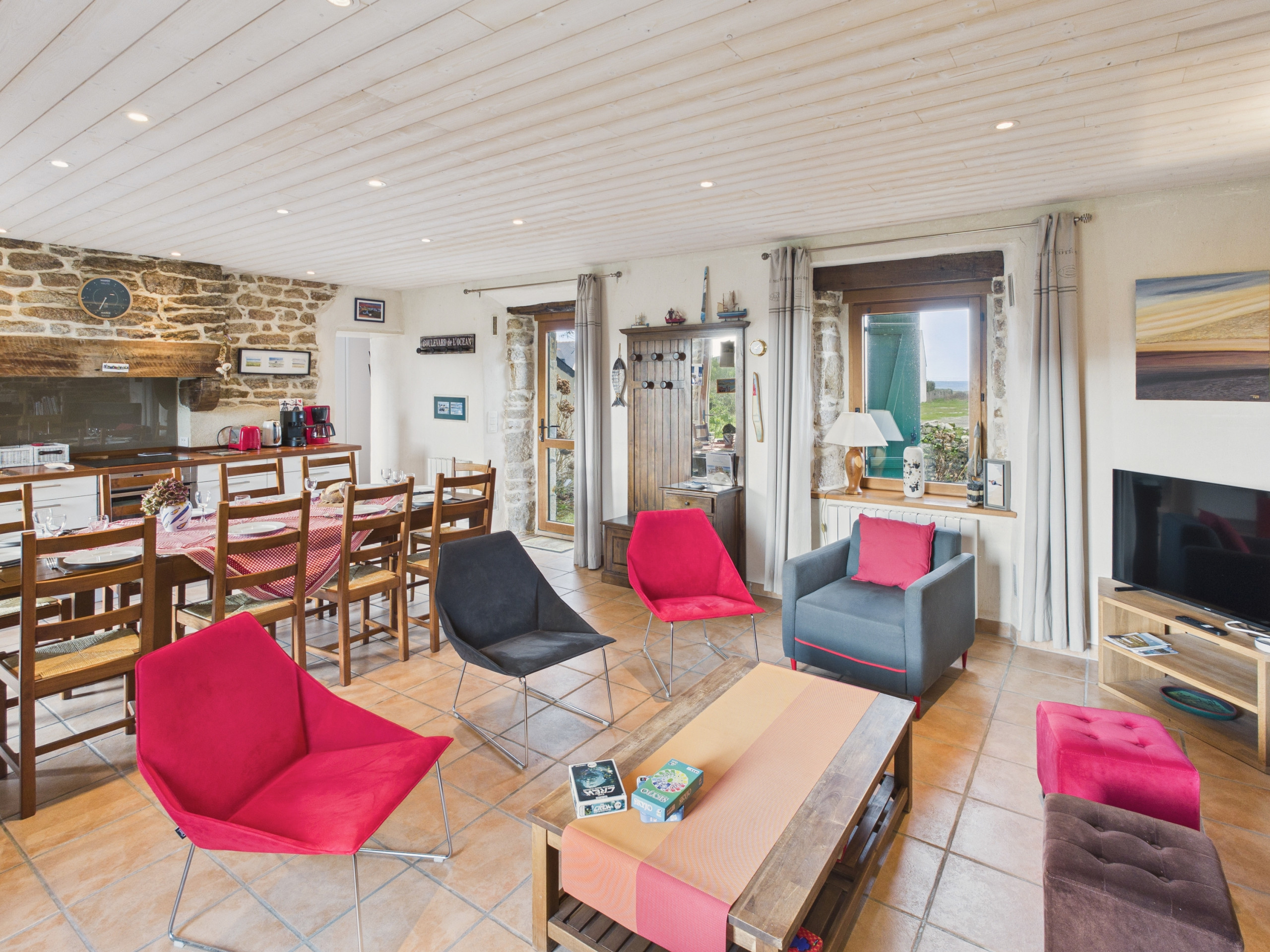 Cruce la puerta de entrada y descubra una gran sala de estar que da acceso al jardín y a la terraza. La cocina abierta, completamente equipada (refrigerador, placas de inducción, horno, lavavajillas), le permitirá preparar sus comidas como en casa. Para el desayuno, también dispondrá de una hervidor, una tostadora y una cafetera de filtro. Comparta sus comidas alrededor de la mesa interior o prefiera la del exterior en los días hermosos. Por la noche, reúnase en la zona de estar, junto a la chimenea decorativa, cómodamente sentados en los sofás frente a la televisión.