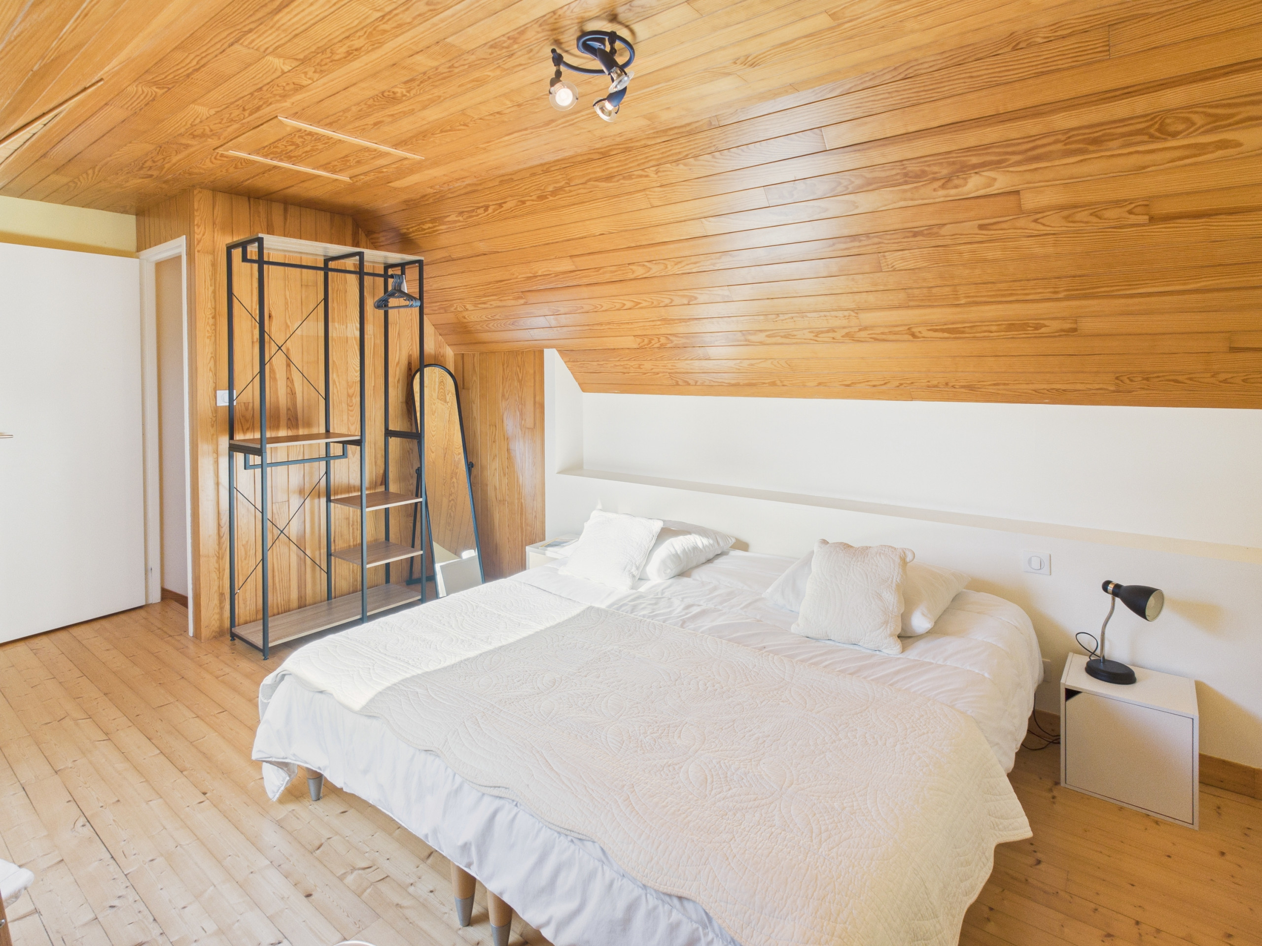 El alojamiento cuenta con una habitación en el piso superior, dispone de dos camas individuales (90x190cm) juntas formando una cama King Size, un estante de almacenamiento y un escritorio.