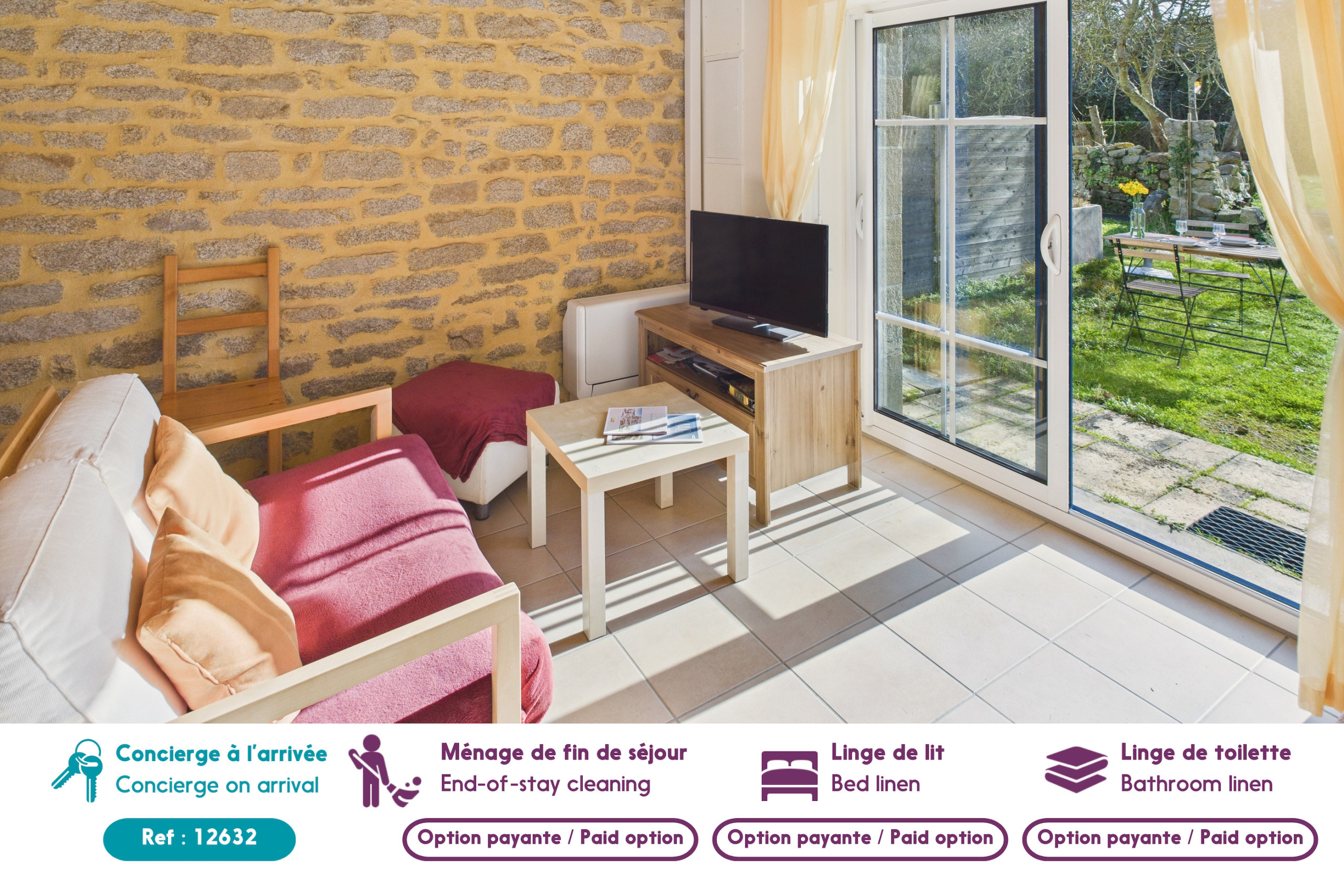 La zona de estar es luminosa, ya que la puerta acristalada da al jardín, encontrará una cocina colorida equipada con placas vitrocerámicas, un refrigerador, un horno, una lavadora, una cafetera de filtro, una tostadora, una hervidor y un exprimidor de cítricos, esta última está abierta al salón-comedor.