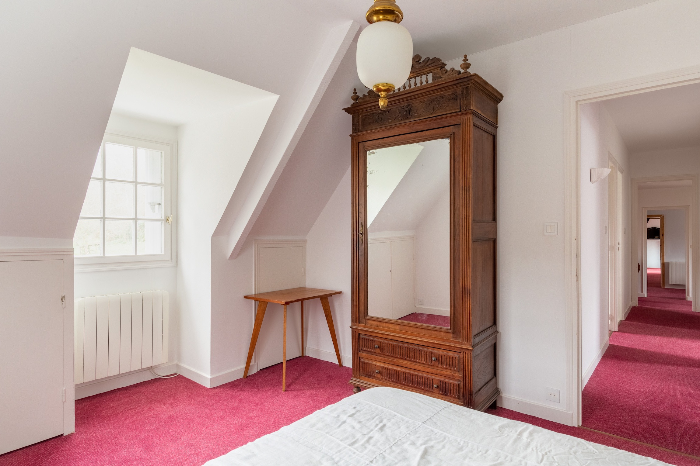 Accesible desde el salón, la suite familiar está dotada de una cama de matrimonio y una cama individual que da al parque con terraza privativa, así como una gran cama king size en altillo con una vista impresionante al mar. Un cuarto de ducha con lavabo doble y WC independientes arriba y abajo completan este espacio confortable.