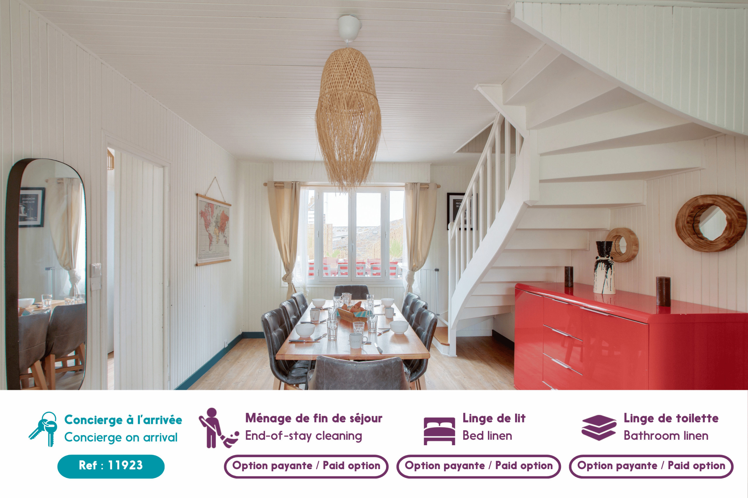 En el interior, encontrará un comedor alargado que lo invita a sentarse alrededor de la gran mesa para compartir momentos de convivencia. Está abierto a una cocina moderna y totalmente equipada (placa de inducción, horno eléctrico, nevera, microondas, congelador, lavavajillas, cafetera espresso, tostadora, tetera y exprimidor).