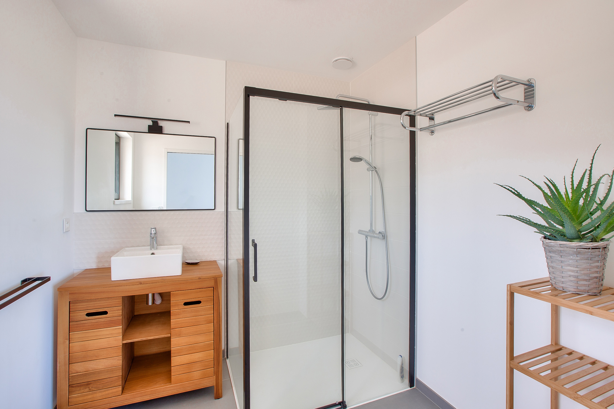 Siempre en la planta baja, encontrarán un aseo independiente, una ducha, una habitación con una cama Queen-size, así como un cuarto de baño con ducha, doble lavabo y aseo.
