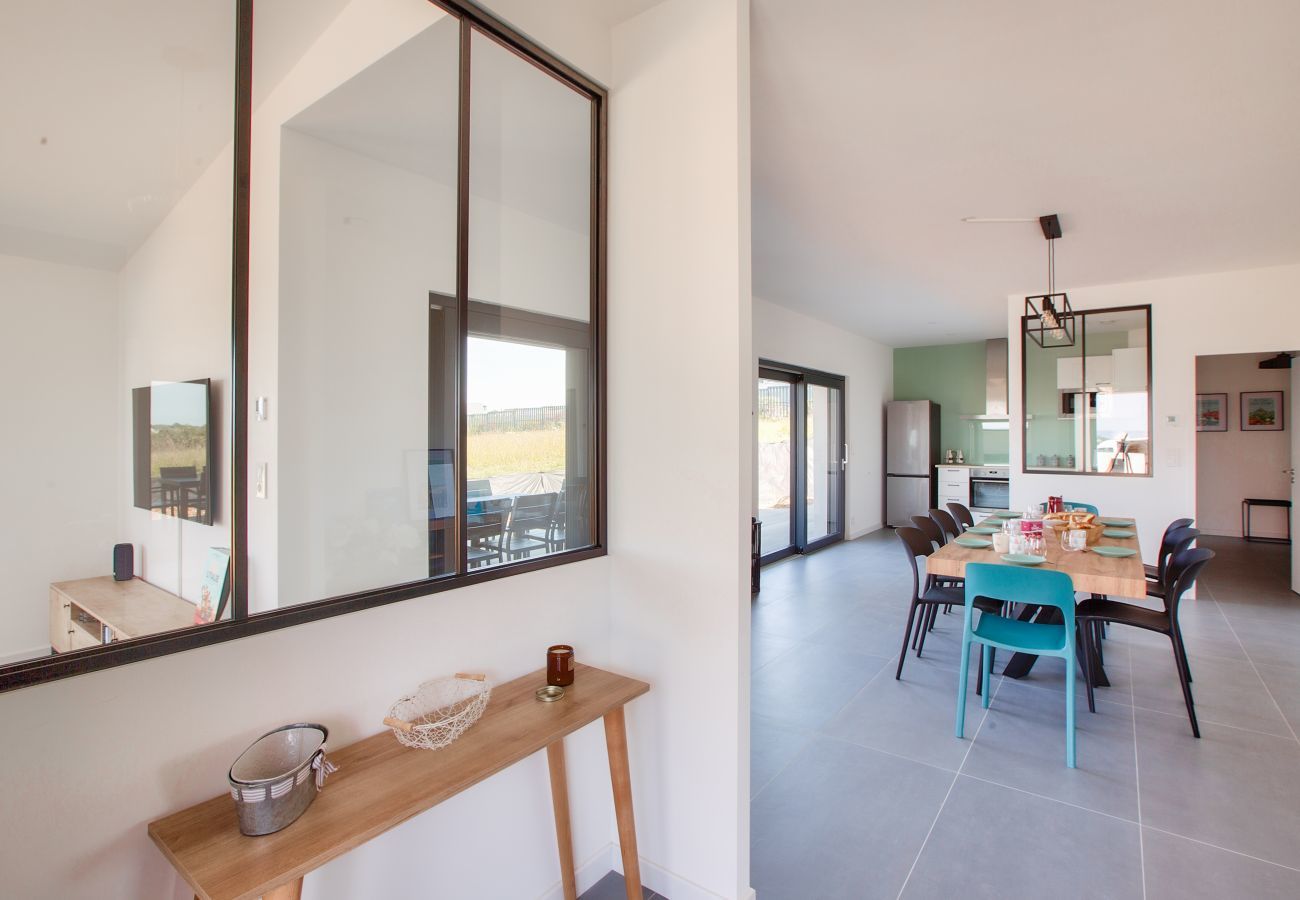 En el interior, encontrará un comedor alargado que lo invita a sentarse alrededor de la gran mesa para compartir momentos de convivencia. Está abierto a una cocina moderna y totalmente equipada (placa de inducción, horno eléctrico, nevera, microondas, congelador, lavavajillas, cafetera espresso, tostadora, tetera y exprimidor).
