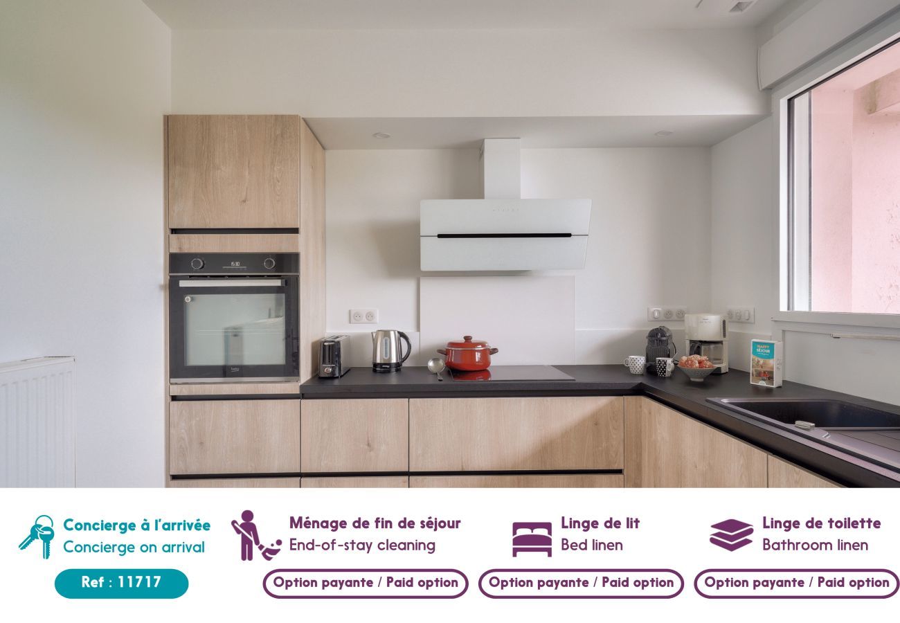 El espacio de vida es acogedor, con sus aberturas que ofrecen una vista al jardín y la piscina durante todo el año. Esto lo convierte en un espacio agradable donde le encantará reunirse alrededor de buenas comidas, frente a una película en la televisión o simplemente para relajarse leyendo. En cuanto a la cocina, está muy bien equipada para que pueda preparar sus comidas con facilidad. Dispone de placas de inducción, un refrigerador, un microondas, un horno, un congelador, un lavavajillas, vajilla, utensilios de cocina, una cafetera de filtro, una cafetera Nespresso, una tostadora y una hervidor.